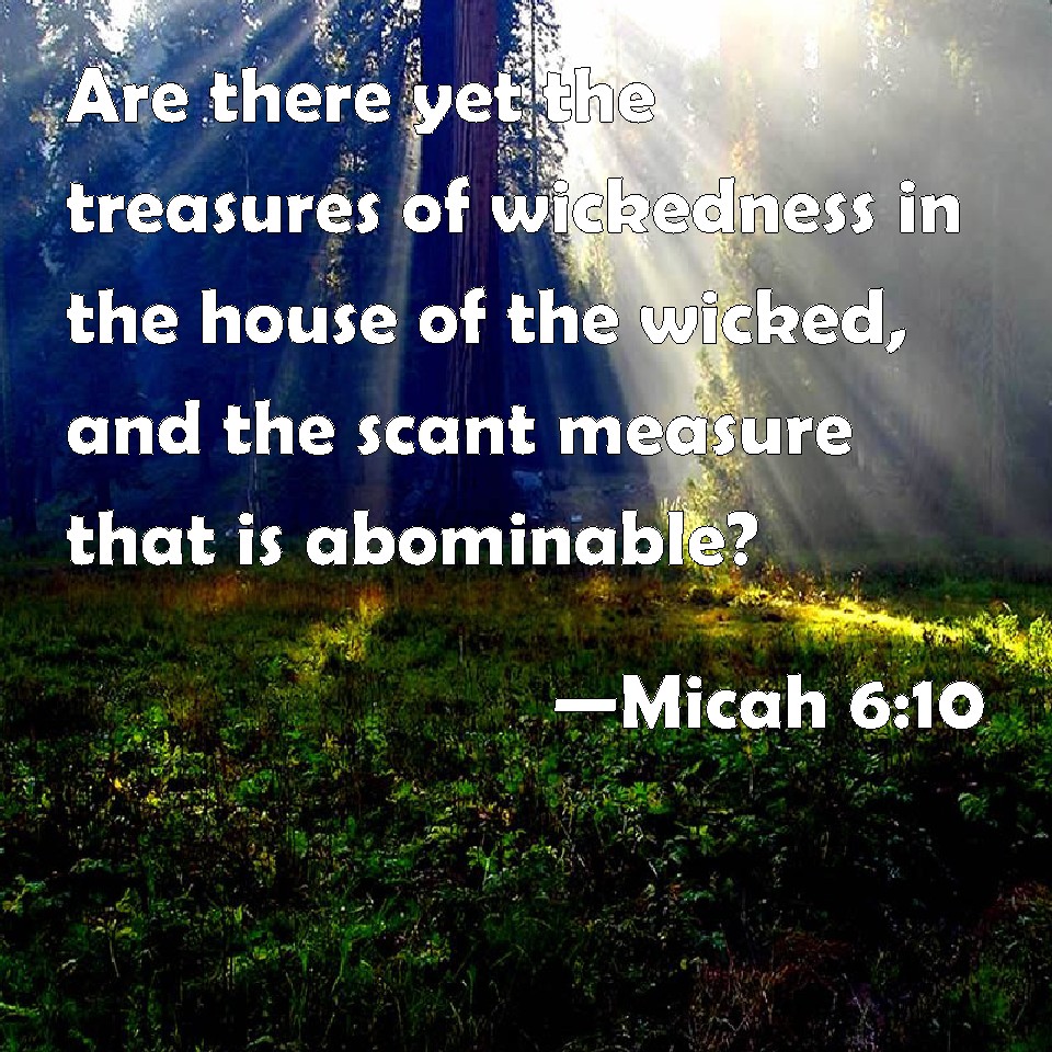 Micah 6:10 Are there yet the treasures of wickedness in the house of the wicked, and the scant measure that is abominable?