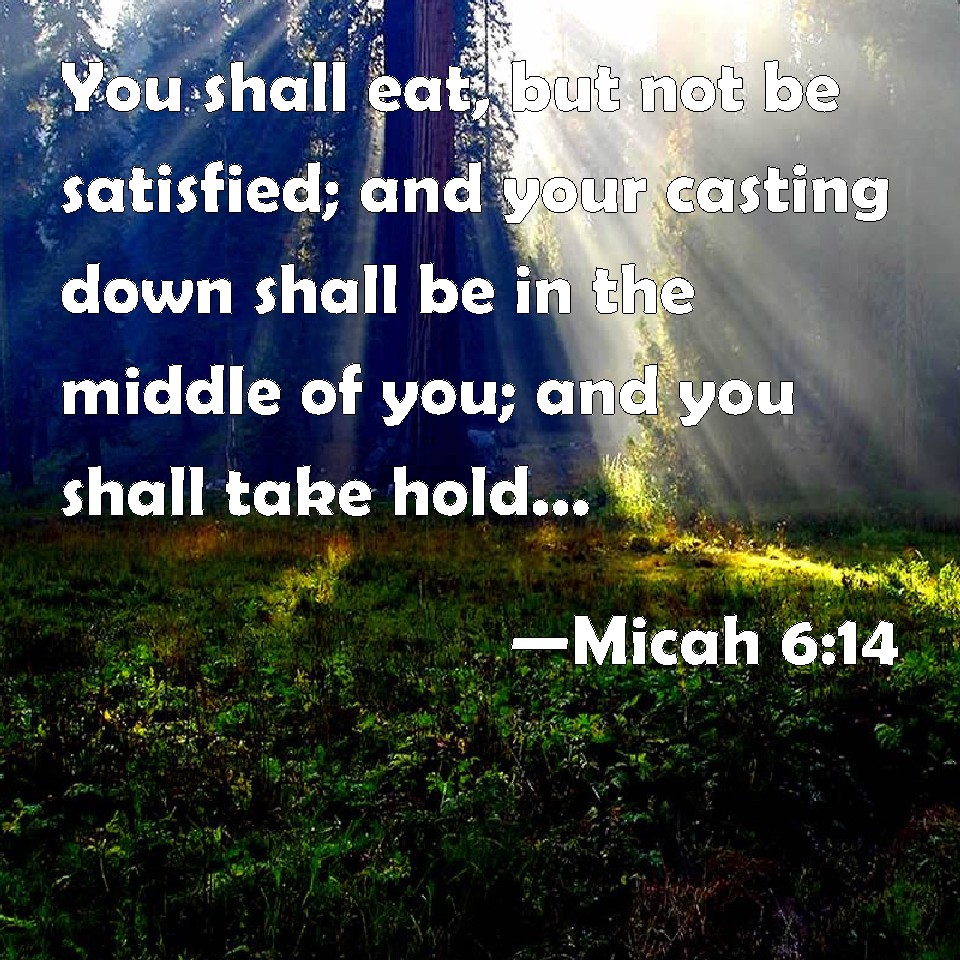 Choose a Background Micah 6:14 You shall eat, but not be satisfied; and your casting down shall be in the middle of you; and you shall take hold, but shall not deliver; and that which you deliver will I give up to the sword. KJV: Thou shalt eat, but not be satisfied; and thy casting down shall be in the midst of thee; and thou shalt take hold, but shalt not deliver; and that which thou deliverest will I give up to the sword. DRB: Thou shalt eat, but shalt not be filled: and thy humiliation shall be in the midst of thee: and thou shalt take hold, but shalt not save: and those whom thou shalt save, I will give up to the sword. DBT: Thou shalt eat, and not be satisfied, and thine emptiness shall remain in the midst of thee; and thou shalt take away, and not save; and what thou savest will I give up to the sword. ERV: Thou shalt eat, but not be satisfied; and thy humiliation shall be in the midst of thee: and thou shalt remove, but shalt not carry away safe; and that which thou carriest away will I give up to the sword. WBT: Thou shalt eat, but not be satisfied; and thy casting down shall be in the midst of thee; and thou shalt take hold, but shalt not deliver; and that which thou deliverest will I give up to the sword. WEB: You shall eat, but not be satisfied. Your humiliation will be in your midst. You will store up, but not save; and that which you save I will give up to the sword. YLT: Thou — thou eatest, and thou art not satisfied, And thy pit is in thy midst, And thou removest, and dost not deliver, And that which thou deliverest, to a sword I give.Links Micah 6:14 NIV • Micah 6:14 NLT • Micah 6:14 ESV • Micah 6:14 NASB • Micah 6:14 KJV • Micah 6:14 Interlinear • Micah 6:14 Commentaries • Micah 6:14 Parallel Texts • Micah 6:14 Bible Apps • Micah 6:14 Parallel • Bible Hub |