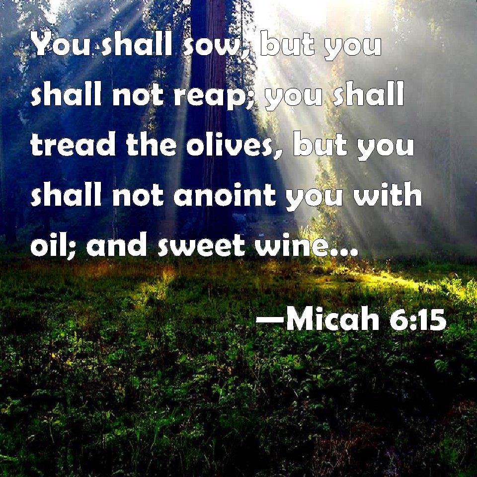 Choose a Background Micah 6:15 You shall sow, but you shall not reap; you shall tread the olives, but you shall not anoint you with oil; and sweet wine, but shall not drink wine. KJV: Thou shalt sow, but thou shalt not reap; thou shalt tread the olives, but thou shalt not anoint thee with oil; and sweet wine, but shalt not drink wine. DRB: Thou shalt sow, but shalt not reap: thou shalt tread the olives, but shalt not be anointed with the oil: and the new wine, but shalt not drink the wine. DBT: Thou shalt sow, but thou shalt not reap; thou shalt tread the olives, but thou shalt not anoint thee with oil; and new wine, but shalt not drink wine. ERV: Thou shalt sow, but shalt not reap: thou shalt tread the olives, but shalt not anoint thee with oil; and the vintage, but shalt not drink the wine. WBT: Thou shalt sow, but thou shalt not reap; thou shalt tread the olives, but thou shalt not anoint thee with oil; and sweet wine, but shalt not drink wine. WEB: You will sow, but won't reap. You will tread the olives, but won't anoint yourself with oil; and crush grapes, but won't drink the wine. YLT: Thou — thou sowest, and thou dost not reap, Thou — thou treadest the olive, And thou pourest not out oil, And new wine — and thou drinkest not wine.Links Micah 6:15 NIV • Micah 6:15 NLT • Micah 6:15 ESV • Micah 6:15 NASB • Micah 6:15 KJV • Micah 6:15 Interlinear • Micah 6:15 Commentaries • Micah 6:15 Parallel Texts • Micah 6:15 Bible Apps • Micah 6:15 Parallel • Bible Hub |
