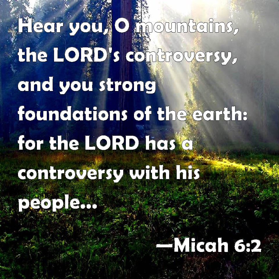 Choose a Background Micah 6:2 Hear you, O mountains, the LORD's controversy, and you strong foundations of the earth: for the LORD has a controversy with his people, and he will plead with Israel. KJV: Hear ye, O mountains, the LORD'S controversy, and ye strong foundations of the earth: for the LORD hath a controversy with his people, and he will plead with Israel. DRB: Let the mountains hear the judgment of the Lord, and the strong foundations of the earth: for the Lord will enter into judgment with his people, and he will plead against Israel. DBT: Hear, ye mountains, Jehovah's controversy, and ye, unchanging foundations of the earth; for Jehovah hath a controversy with his people, and he will plead with Israel. ERV: Hear, O ye mountains, the LORD'S controversy, and ye enduring foundations of the earth: for the LORD hath a controversy with his people, and he will plead with Israel. WBT: Hear ye, O mountains, the LORD'S controversy, and ye strong foundations of the earth: for the LORD hath a controversy with his people, and he will plead with Israel. WEB: Hear, you mountains, Yahweh's controversy, and you enduring foundations of the earth; for Yahweh has a controversy with his people, and he will contend with Israel. YLT: Hear, O mountains, the strife of Jehovah, Ye strong ones — foundations of earth! For a strife is to Jehovah, with His people, And with Israel He doth reason.Links Micah 6:2 NIV • Micah 6:2 NLT • Micah 6:2 ESV • Micah 6:2 NASB • Micah 6:2 KJV • Micah 6:2 Interlinear • Micah 6:2 Commentaries • Micah 6:2 Parallel Texts • Micah 6:2 Bible Apps • Micah 6:2 Parallel • Bible Hub |