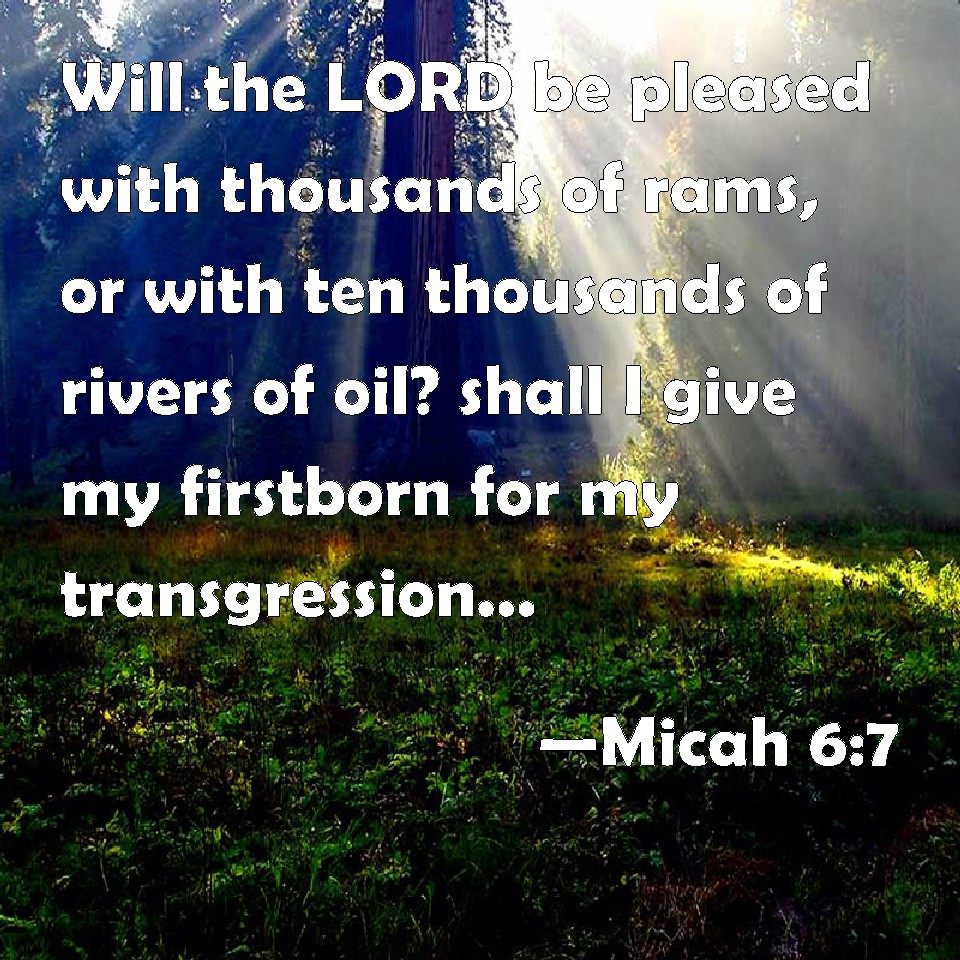 Choose a Background Micah 6:7 Will the LORD be pleased with thousands of rams, or with ten thousands of rivers of oil? shall I give my firstborn for my transgression, the fruit of my body for the sin of my soul? KJV: Will the LORD be pleased with thousands of rams, or with ten thousands of rivers of oil? shall I give my firstborn for my transgression, the fruit of my body for the sin of my soul? DRB: May the Lord be appeased with thousands of rams, or with many thousands of fat he goats? shall I give my firstborn for my wickedness, the fruit of my body for the sin of my soul? DBT: Will Jehovah take pleasure in thousands of rams, in ten thousands of rivers of oil? Shall I give my firstborn for my transgression, the fruit of my body for the sin of my soul? ERV: will the LORD be pleased with thousands of rams, or with ten thousands of rivers of oil? shall I give my firstborn for my transgression, the fruit of my body for the sin of my soul? WBT: Will the LORD be pleased with thousands of rams, or with ten thousands of rivers of oil? shall I give my first-born for my transgression, the fruit of my body for the sin of my soul? WEB: Will Yahweh be pleased with thousands of rams? With tens of thousands of rivers of oil? Shall I give my firstborn for my disobedience? The fruit of my body for the sin of my soul? YLT: Is Jehovah pleased with thousands of rams? With myriads of streams of oil? Do I give my first-born for my transgression? The fruit of my body for the sin of my soul?Links Micah 6:7 NIV • Micah 6:7 NLT • Micah 6:7 ESV • Micah 6:7 NASB • Micah 6:7 KJV • Micah 6:7 Interlinear • Micah 6:7 Commentaries • Micah 6:7 Parallel Texts • Micah 6:7 Bible Apps • Micah 6:7 Parallel • Bible Hub |