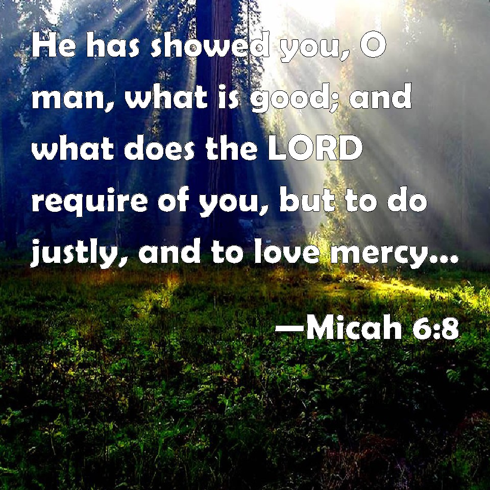 Choose a Background Micah 6:8 He has showed you, O man, what is good; and what does the LORD require of you, but to do justly, and to love mercy, and to walk humbly with your God? KJV: He hath shewed thee, O man, what is good; and what doth the LORD require of thee, but to do justly, and to love mercy, and to walk humbly with thy God? DRB: I will shew thee, O man, what is good, and what the Lord requireth of thee: Verily, to do judgment, and to love mercy, and to walk solicitous with thy God. DBT: He hath shewn thee, O man, what is good: and what doth Jehovah require of thee, but to do justly, and to love goodness, and to walk humbly with thy God? ERV: He hath shewed thee, O man, what is good; and what doth the LORD require of thee, but to do justly, and to love mercy, and to walk humbly with thy God? WBT: He hath shown thee, O man, what is good; and what the LORD doth require of thee, but to do justly, and to love mercy, and to walk humbly with thy God? WEB: He has shown you, O man, what is good. What does Yahweh require of you, but to act justly, to love mercy, and to walk humbly with your God? YLT: He hath declared to thee, O man, what is good; Yea, what is Jehovah requiring of thee, Except — to do judgment, and love kindness, And lowly to walk with thy God?Links Micah 6:8 NIV • Micah 6:8 NLT • Micah 6:8 ESV • Micah 6:8 NASB • Micah 6:8 KJV • Micah 6:8 Interlinear • Micah 6:8 Commentaries • Micah 6:8 Parallel Texts • Micah 6:8 Bible Apps • Micah 6:8 Parallel • Bible Hub |