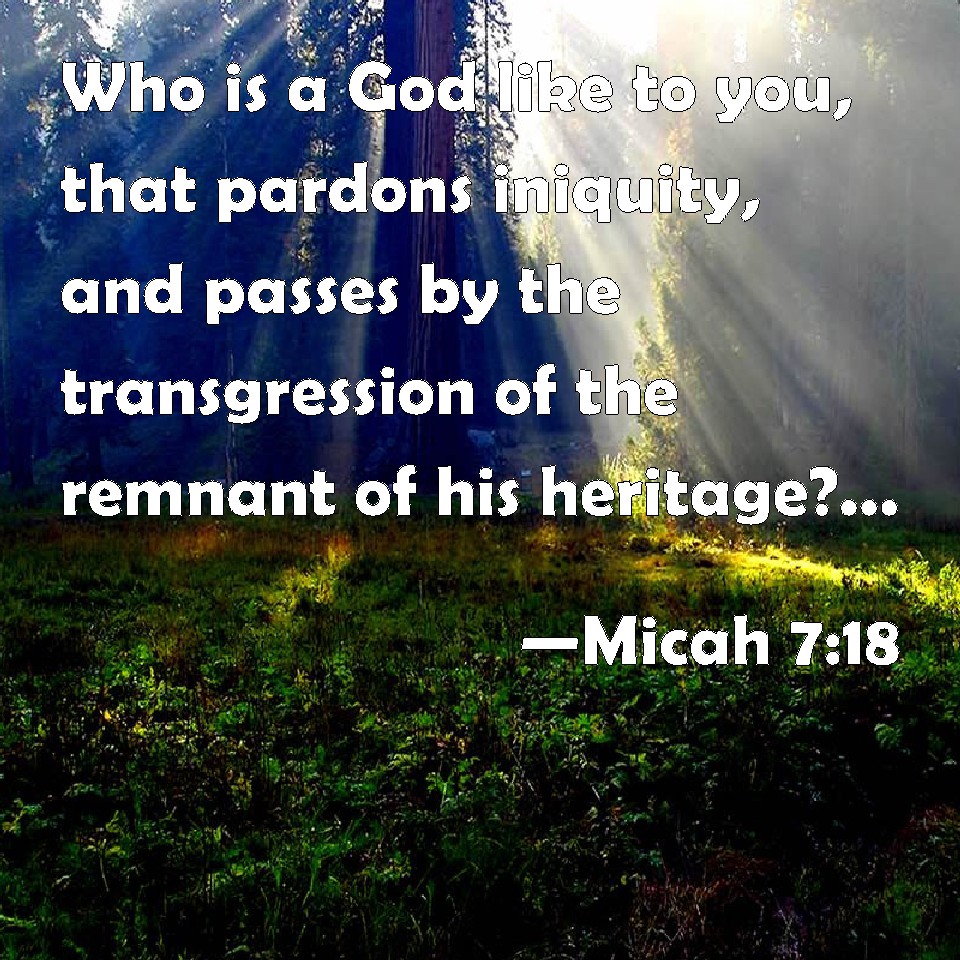 Choose a Background Micah 7:18 Who is a God like to you, that pardons iniquity, and passes by the transgression of the remnant of his heritage? he retains not his anger for ever, because he delights in mercy. KJV: Who is a God like unto thee, that pardoneth iniquity, and passeth by the transgression of the remnant of his heritage? he retaineth not his anger for ever, because he delighteth in mercy. DRB: Who is a God like to thee, who takest away iniquity, and passest by the sin of the remnant of thy inheritance? he will send his fury in no more, because he delighteth in mercy. DBT: Who is a God like unto thee, that forgiveth iniquity, and passeth by the transgression of the remnant of his heritage? He retaineth not his anger for ever, because he delighteth in loving-kindness. ERV: Who is a God like unto thee, that pardoneth iniquity, and passeth by the transgression of the remnant of his heritage? he retaineth not his anger for ever, because he delighteth in mercy. WBT: Who is a God like to thee, that pardoneth iniquity, and passeth by the transgression of the remnant of his heritage? he retaineth not his anger for ever, because he delighteth in mercy. WEB: Who is a God like you, who pardons iniquity, and passes over the disobedience of the remnant of his heritage? He doesn't retain his anger forever, because he delights in loving kindness. YLT: Who is a God like Thee? taking away iniquity, And passing by the transgression of the remnant of His inheritance, He hath not retained for ever His anger, Because He — He delighteth in kindness.Links Micah 7:18 NIV • Micah 7:18 NLT • Micah 7:18 ESV • Micah 7:18 NASB • Micah 7:18 KJV • Micah 7:18 Interlinear • Micah 7:18 Commentaries • Micah 7:18 Parallel Texts • Micah 7:18 Bible Apps • Micah 7:18 Parallel • Bible Hub |
