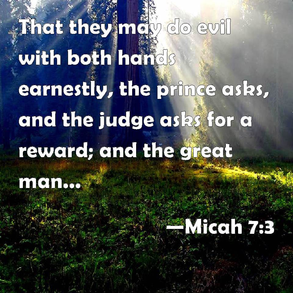Choose a Background Micah 7:3 That they may do evil with both hands earnestly, the prince asks, and the judge asks for a reward; and the great man, he utters his mischievous desire: so they wrap it up. KJV: That they may do evil with both hands earnestly, the prince asketh, and the judge asketh for a reward; and the great man, he uttereth his mischievous desire: so they wrap it up. DRB: The evil of their hands they call good: the prince requireth, and the judge is for giving: and the great man hath uttered the desire of his soul, and they have troubled it. DBT: Both hands are for evil, to do it well. The prince asketh, and the judge is there for a reward; and the great man uttereth his soul's greed: and together they combine it. ERV: Their hands are upon that which is evil to do it diligently; the prince asketh, and the judge is ready for a reward; and the great man, he uttereth the mischief of his soul: thus they weave it together. WBT: That they may do evil with both hands earnestly, the prince asketh, and the judge asketh for a reward; and the great man, he uttereth his mischievous desire: so they wrap it up. WEB: Their hands are on that which is evil to do it diligently. The ruler and judge ask for a bribe; and the powerful man dictates the evil desire of his soul. Thus they conspire together. YLT: On the evil are both hands to do it well, The prince is asking — also the judge — for recompence, And the great — he is speaking the mischief of his soul, And they wrap it up.Links Micah 7:3 NIV • Micah 7:3 NLT • Micah 7:3 ESV • Micah 7:3 NASB • Micah 7:3 KJV • Micah 7:3 Interlinear • Micah 7:3 Commentaries • Micah 7:3 Parallel Texts • Micah 7:3 Bible Apps • Micah 7:3 Parallel • Bible Hub |