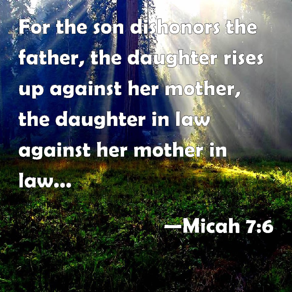 Choose a Background Micah 7:6 For the son dishonors the father, the daughter rises up against her mother, the daughter in law against her mother in law; a man's enemies are the men of his own house. KJV: For the son dishonoureth the father, the daughter riseth up against her mother, the daughter in law against her mother in law; a man's enemies are the men of his own house. DRB: For the son dishonoureth the father, and the daughter riseth up against her mother, the daughter in law against her mother in law: and a man's enemies are they of his own household. DBT: For the son dishonoureth the father, the daughter riseth up against her mother, the daughter-in-law against her mother-in-law: a man's enemies are the men of his own household. ERV: For the son dishonoureth the father, the daughter riseth up against her mother, the daughter in law against her mother in law; a man's enemies are the men of his own house. WBT: For the son dishonoreth the father, the daughter riseth up against her mother, the daughter-in-law against her mother-in-law; a man's enemies are the men of his own house. WEB: For the son dishonors the father, the daughter rises up against her mother, the daughter-in-law against her mother-in-law; a man's enemies are the men of his own house. YLT: For a son is dishonouring a father, A daughter hath stood against her mother, A daughter-in-law against her mother-in-law, The enemies of each are the men of his house.Links Micah 7:6 NIV • Micah 7:6 NLT • Micah 7:6 ESV • Micah 7:6 NASB • Micah 7:6 KJV • Micah 7:6 Interlinear • Micah 7:6 Commentaries • Micah 7:6 Parallel Texts • Micah 7:6 Bible Apps • Micah 7:6 Parallel • Bible Hub |