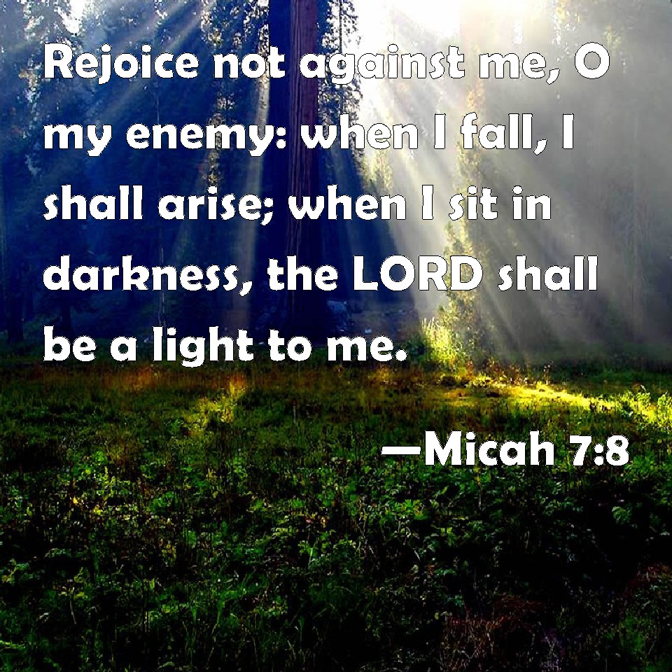 Choose a Background Micah 7:8 Rejoice not against me, O my enemy: when I fall, I shall arise; when I sit in darkness, the LORD shall be a light to me. KJV: Rejoice not against me, O mine enemy: when I fall, I shall arise; when I sit in darkness, the LORD shall be a light unto me. DRB: Rejoice not, thou, my enemy, over me, because I am fallen: I shall arise, when I sit in darkness, the Lord is my light. DBT: Rejoice not against me, O mine enemy: though I fall, I shall arise; when I sit in darkness, Jehovah shall be a light unto me. ERV: Rejoice not against me, O mine enemy: when I fall, I shall arise; when I sit in darkness, the LORD shall be a light unto me. WBT: Rejoice not against me, O my enemy: when I fall, I shall arise; when I sit in darkness, the LORD will be a light to me. WEB: Don't rejoice against me, my enemy. When I fall, I will arise. When I sit in darkness, Yahweh will be a light to me. YLT: Thou dost not rejoice over me, O mine enemy, When I have fallen, I have risen, When I sit in darkness Jehovah is a light to me.Links Micah 7:8 NIV • Micah 7:8 NLT • Micah 7:8 ESV • Micah 7:8 NASB • Micah 7:8 KJV • Micah 7:8 Interlinear • Micah 7:8 Commentaries • Micah 7:8 Parallel Texts • Micah 7:8 Bible Apps • Micah 7:8 Parallel • Bible Hub |