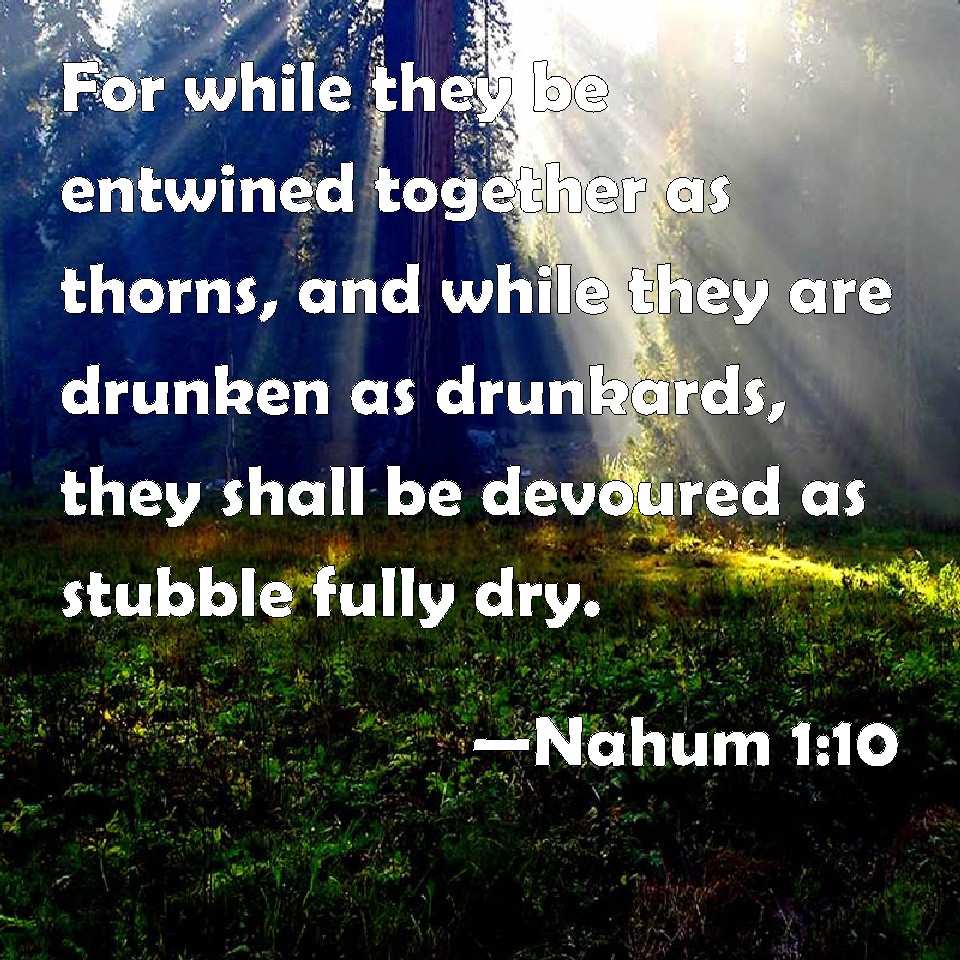 Choose a Background Nahum 1:10 For while they be entwined together as thorns, and while they are drunken as drunkards, they shall be devoured as stubble fully dry. KJV: For while they be folden together as thorns, and while they are drunken as drunkards, they shall be devoured as stubble fully dry. DRB: For as thorns embrace one another: so while they are feasting and drinking together, they shall be consumed as stubble that is fully dry. DBT: Though they be tangled together as thorns, and be as drenched from their drink, they shall be devoured as dry stubble, completely. ERV: For though they be like tangled thorns, told be drenched as it were in their drink, they shall be devoured utterly as dry stubble. WBT: For while they are folded together as thorns, and while they are drunken as drunkards, they shall be devoured as stubble fully dry. WEB: For entangled like thorns, and drunken as with their drink, they are consumed utterly like dry stubble. YLT: For while princes are perplexed, And with their drink are drunken, They have been consumed as stubble fully dried.Links Nahum 1:10 NIV • Nahum 1:10 NLT • Nahum 1:10 ESV • Nahum 1:10 NASB • Nahum 1:10 KJV • Nahum 1:10 Interlinear • Nahum 1:10 Commentaries • Nahum 1:10 Parallel Texts • Nahum 1:10 Bible Apps • Nahum 1:10 Parallel • Bible Hub |