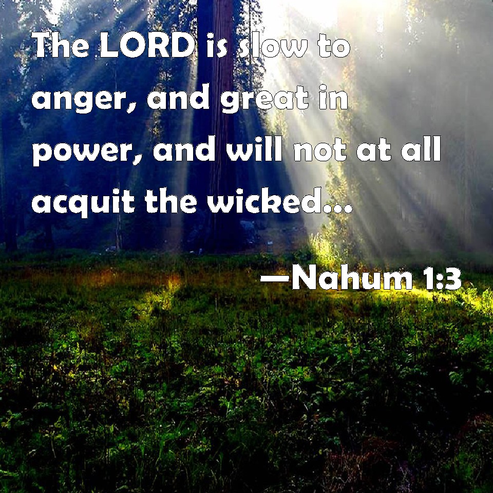 Choose a Background Nahum 1:3 The LORD is slow to anger, and great in power, and will not at all acquit the wicked: the LORD has his way in the whirlwind and in the storm, and the clouds are the dust of his feet. KJV: The LORD is slow to anger, and great in power, and will not at all acquit the wicked: the LORD hath his way in the whirlwind and in the storm, and the clouds are the dust of his feet. DRB: The Lord is patient, and great in power, and will not cleanse and acquit the guilty. The Lord's ways are in a tempest, and a whirlwind, and clouds are the dust of his feet. DBT: Jehovah is slow to anger, and great in power, and doth not at all clear the guilty: Jehovah, his way is in the whirlwind and in the storm, and the clouds are the dust of his feet. ERV: The LORD is slow to anger, and great in power, and will by no means clear the guilty: the LORD hath his way in the whirlwind and in the storm, and the clouds are the dust of his feet. WBT: The LORD is slow to anger, and great in power, and will not at all acquit the wicked: the LORD hath his way in the whirlwind and in the storm, and the clouds are the dust of his feet. WEB: Yahweh is slow to anger, and great in power, and will by no means leave the guilty unpunished. Yahweh has his way in the whirlwind and in the storm, and the clouds are the dust of his feet. YLT: Jehovah is slow to anger, and great in power, And Jehovah doth not entirely acquit, In a hurricane and in a tempest is His way, And a cloud is the dust of His feet.Links Nahum 1:3 NIV • Nahum 1:3 NLT • Nahum 1:3 ESV • Nahum 1:3 NASB • Nahum 1:3 KJV • Nahum 1:3 Interlinear • Nahum 1:3 Commentaries • Nahum 1:3 Parallel Texts • Nahum 1:3 Bible Apps • Nahum 1:3 Parallel • Bible Hub |