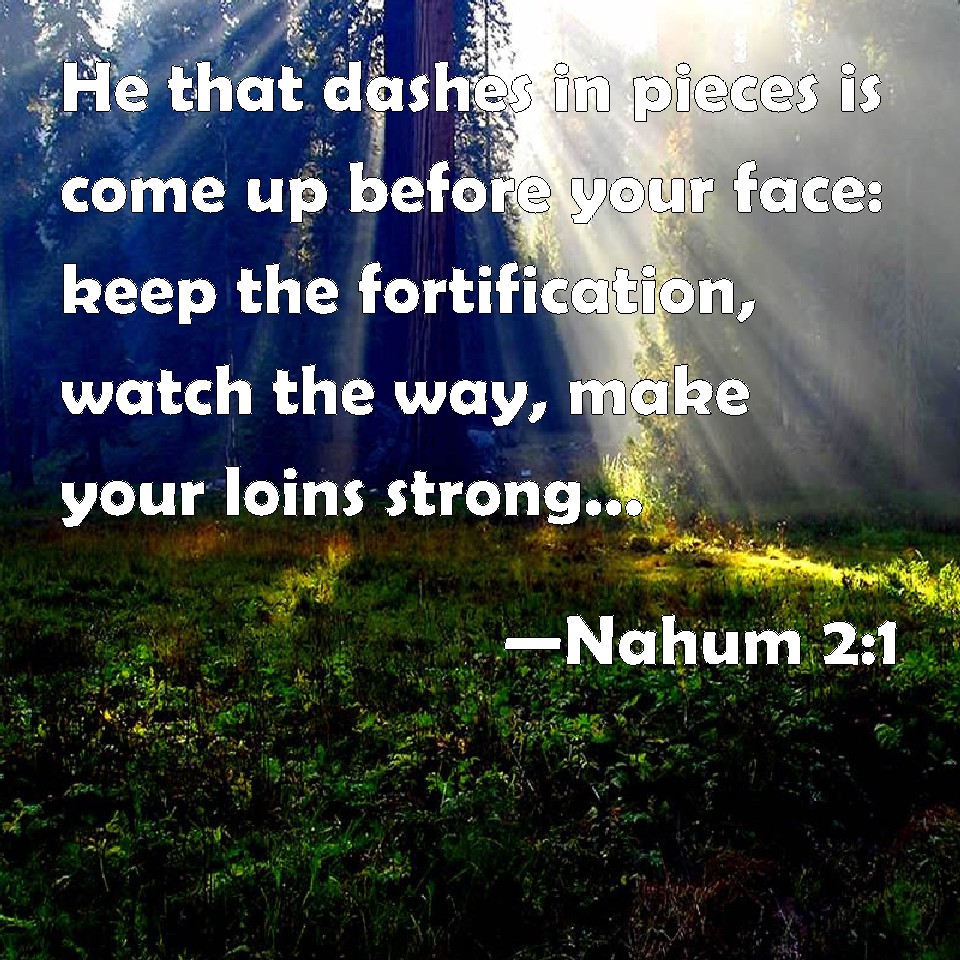 Choose a Background Nahum 2:1 He that dashes in pieces is come up before your face: keep the fortification, watch the way, make your loins strong, fortify your power mightily. KJV: He that dasheth in pieces is come up before thy face: keep the munition, watch the way, make thy loins strong, fortify thy power mightily. DRB: He is come up that shall destroy before thy face, that shall keep the siege: watch the way, fortify thy loins, strengthen thy power exceedingly. DBT: He that dasheth in pieces is come up against thy face: keep the fortress, watch the way, make thy loins strong, fortify thy power mightily. ERV: He that dasheth in pieces is come up before thy face: keep the munition, watch the way, make thy loins strong, fortify thy power mightily. WBT: He that dasheth in pieces is come up before thy face: keep the munition, watch the way, make thy loins strong, fortify thy power mightily. WEB: He who dashes in pieces has come up against you. Keep the fortress! Watch the way! Strengthen your waist! Fortify your power mightily! YLT: Come up hath a scatterer to thy face, Keep the bulwark, watch the way, Strengthen the loins, strengthen power mightily.Links Nahum 2:1 NIV • Nahum 2:1 NLT • Nahum 2:1 ESV • Nahum 2:1 NASB • Nahum 2:1 KJV • Nahum 2:1 Interlinear • Nahum 2:1 Commentaries • Nahum 2:1 Parallel Texts • Nahum 2:1 Bible Apps • Nahum 2:1 Parallel • Bible Hub |