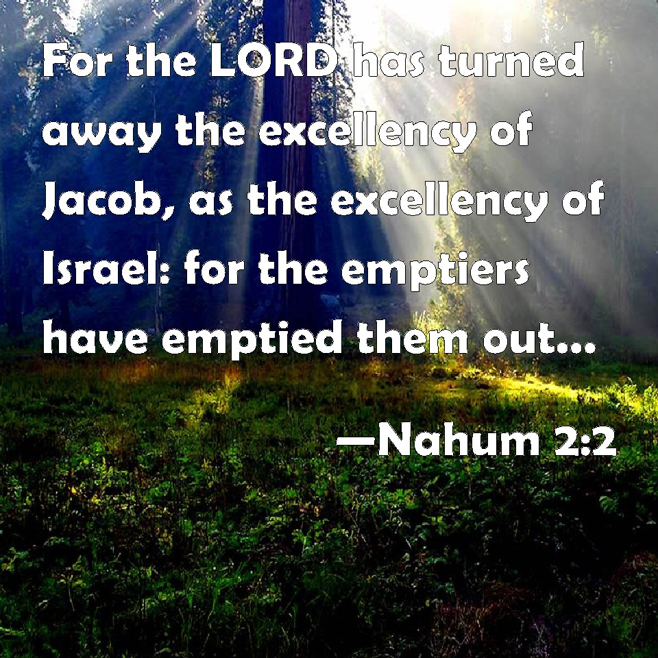 Choose a Background Nahum 2:2 For the LORD has turned away the excellency of Jacob, as the excellency of Israel: for the emptiers have emptied them out, and marred their vine branches. KJV: For the LORD hath turned away the excellency of Jacob, as the excellency of Israel: for the emptiers have emptied them out, and marred their vine branches. DRB: For the Lord hath rendered the pride of Jacob, as the pride of Israel: because the spoilers have laid them waste, and have marred their vine branches. DBT: For Jehovah hath brought again the glory of Jacob, as the glory of Israel; for the wasters have wasted them, and marred their vine-branches. ERV: For the LORD bringeth again the excellency of Jacob, as the excellency of Israel: for the emptiers have emptied them out, and marred their vine branches. WBT: For the LORD hath turned away the excellence of Jacob, as the excellence of Israel: for the emptiers have emptied them out, and marred their vine branches. WEB: For Yahweh restores the excellency of Jacob, as the excellency of Israel; for the destroyers have destroyed them, and ruined their vine branches. YLT: For turned back hath Jehovah to the excellency of Jacob, As to the excellency of Israel, For emptied them out have emptiers, And their branches they have marred.Links Nahum 2:2 NIV • Nahum 2:2 NLT • Nahum 2:2 ESV • Nahum 2:2 NASB • Nahum 2:2 KJV • Nahum 2:2 Interlinear • Nahum 2:2 Commentaries • Nahum 2:2 Parallel Texts • Nahum 2:2 Bible Apps • Nahum 2:2 Parallel • Bible Hub |