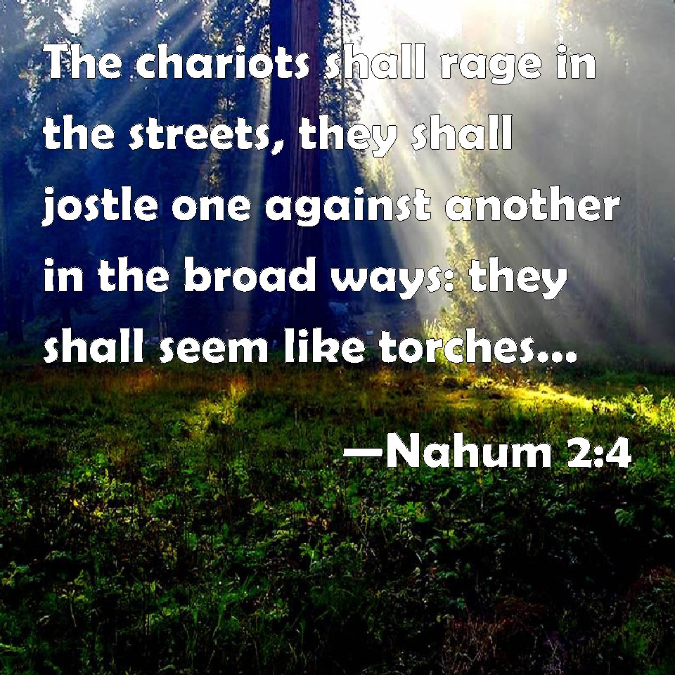 Choose a Background Nahum 2:4 The chariots shall rage in the streets, they shall jostle one against another in the broad ways: they shall seem like torches, they shall run like the lightning. KJV: The chariots shall rage in the streets, they shall justle one against another in the broad ways: they shall seem like torches, they shall run like the lightnings. DRB: They are in confusion in the ways, the chariots jostle one against another in the streets: their looks are like torches, like lightning running to and fro. DBT: The chariots rush madly in the streets, they justle one against another in the broad ways: the appearance of them is like torches, they run like lightnings. ERV: The chariots rage in the streets, they justle one against another in the broad ways: the appearance of them is like torches, they run like the lightnings. WBT: The chariots shall rage in the streets, they shall jostle one against another in the broad ways: they shall seem like torches, they shall run like the lightnings. WEB: The chariots rage in the streets. They rush back and forth in the broad ways. Their appearance is like torches. They run like the lightnings. YLT: In out-places shine do the chariots, They go to and fro in broad places, Their appearances are like torches, As lightnings they run.Links Nahum 2:4 NIV • Nahum 2:4 NLT • Nahum 2:4 ESV • Nahum 2:4 NASB • Nahum 2:4 KJV • Nahum 2:4 Interlinear • Nahum 2:4 Commentaries • Nahum 2:4 Parallel Texts • Nahum 2:4 Bible Apps • Nahum 2:4 Parallel • Bible Hub |