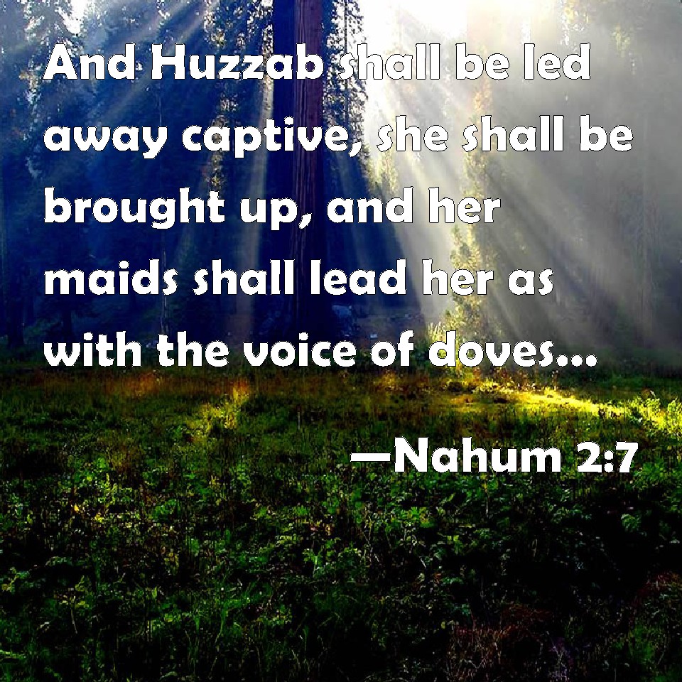 Choose a Background Nahum 2:7 And Huzzab shall be led away captive, she shall be brought up, and her maids shall lead her as with the voice of doves, beating on their breasts. KJV: And Huzzab shall be led away captive, she shall be brought up, and her maids shall lead her as with the voice of doves, tabering upon their breasts. DRB: And the soldier is led away captive: and her bondwomen were led away mourning as doves, murmuring in their hearts. DBT: And it is decreed: she shall be uncovered, she shall be led away, and her maids shall moan as with the voice of doves, drumming upon their breasts. ERV: And Huzzab is uncovered, she is carried away, and her handmaids mourn as with the voice of doves, tabering upon their breasts. WBT: And Huzzab shall be led away captive, she shall be brought up, and her maids shall lead her as with the voice of doves, tabering upon their breasts. WEB: It is decreed: she is uncovered, she is carried away; and her handmaids moan as with the voice of doves, beating on their breasts. YLT: And it is established — she hath removed, She hath been brought up, And her handmaids are leading as the voice of doves, Tabering on their hearts.Links Nahum 2:7 NIV • Nahum 2:7 NLT • Nahum 2:7 ESV • Nahum 2:7 NASB • Nahum 2:7 KJV • Nahum 2:7 Interlinear • Nahum 2:7 Commentaries • Nahum 2:7 Parallel Texts • Nahum 2:7 Bible Apps • Nahum 2:7 Parallel • Bible Hub |