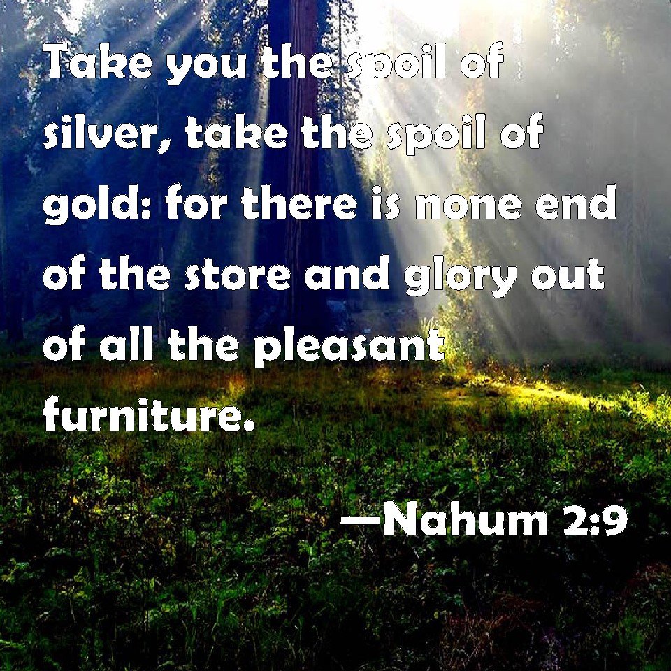Choose a Background Nahum 2:9 Take you the spoil of silver, take the spoil of gold: for there is none end of the store and glory out of all the pleasant furniture. KJV: Take ye the spoil of silver, take the spoil of gold: for there is none end of the store and glory out of all the pleasant furniture. DRB: Take ye the spoil of the silver, take the spoil of the gold: for there is no end of the riches of all the precious furniture. DBT: Plunder the silver, plunder the gold; for there is no end of the splendid store of all precious vessels. ERV: Take ye the spoil of silver, take the spoil of gold: for there is none end of the store, the glory of all pleasant furniture. WBT: Take ye the spoil of silver, take the spoil of gold: for there is no end of the store and glory out of all the pleasant furniture. WEB: Take the spoil of silver. Take the spoil of gold, for there is no end of the store, the glory of all goodly furniture. YLT: Seize ye silver, seize ye gold, And there is no end to the prepared things, To the abundance of all desirable vessels.Links Nahum 2:9 NIV • Nahum 2:9 NLT • Nahum 2:9 ESV • Nahum 2:9 NASB • Nahum 2:9 KJV • Nahum 2:9 Interlinear • Nahum 2:9 Commentaries • Nahum 2:9 Parallel Texts • Nahum 2:9 Bible Apps • Nahum 2:9 Parallel • Bible Hub |