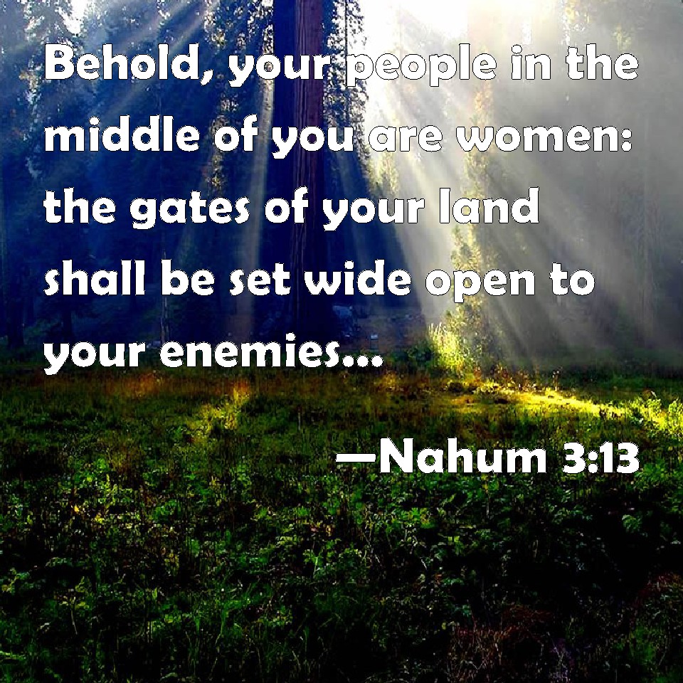 Choose a Background Nahum 3:13 Behold, your people in the middle of you are women: the gates of your land shall be set wide open to your enemies: the fire shall devour your bars. KJV: Behold, thy people in the midst of thee are women: the gates of thy land shall be set wide open unto thine enemies: the fire shall devour thy bars. DRB: Behold thy people in the midst of thee are women: the gates of thy land shall be set wide open to thy enemies, the fire shall devour thy bars. DBT: Behold, thy people in the midst of thee are as women: the gates of thy land are set wide open unto thine enemies; the fire devoureth thy bars. ERV: Behold, thy people in the midst of thee are women; the gates of thy land are set wide open unto thine enemies: the fire hath devoured thy bars. WBT: Behold, thy people in the midst of thee are women: the gates of thy land shall be set wide open to thy enemies: the fire shall devour thy bars. WEB: Behold, your troops in your midst are women. The gates of your land are set wide open to your enemies. The fire has devoured your bars. YLT: Lo, thy people are women in thy midst, To thine enemies thoroughly opened Have been the gates of thy land, Consumed hath fire thy bars.Links Nahum 3:13 NIV • Nahum 3:13 NLT • Nahum 3:13 ESV • Nahum 3:13 NASB • Nahum 3:13 KJV • Nahum 3:13 Interlinear • Nahum 3:13 Commentaries • Nahum 3:13 Parallel Texts • Nahum 3:13 Bible Apps • Nahum 3:13 Parallel • Bible Hub |
