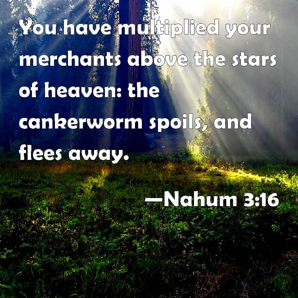Nahum 3:16 You have multiplied your merchants above the stars of heaven: the cankerworm spoils, and flees away.