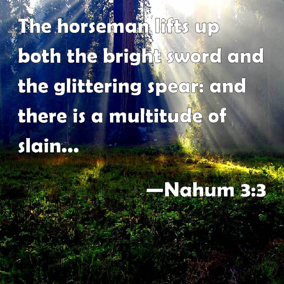 Choose a Background Nahum 3:3 The horseman lifts up both the bright sword and the glittering spear: and there is a multitude of slain, and a great number of carcasses; and there is none end of their corpses; they stumble on their corpses: KJV: The horseman lifteth up both the bright sword and the glittering spear: and there is a multitude of slain, and a great number of carcases; and there is none end of their corpses; they stumble upon their corpses: DRB: And of the shining sword, and of the glittering spear, and of a multitude slain, and of a grievous destruction: and there is no end of carcasses, and they shall fall down on their dead bodies. DBT: The horseman springing up, and the glitter of the sword, and the flash of the spear, and a multitude of slain, and a mass of carcases, and no end of corpses: they stumble over their corpses. ERV: the horseman mounting, and the flashing sword, and the glittering spear; and a multitude of slain, and a great heap of carcases: and there is none end of the corpses; they stumble upon their corpses: WBT: The horseman lifteth up both the bright sword, and the glittering spear: and there is a multitude of slain, and a great number of carcasses; and there is no end of their corpses; they stumble upon their corpses: WEB: the horseman mounting, and the flashing sword, the glittering spear, and a multitude of slain, and a great heap of corpses, and there is no end of the bodies. They stumble on their bodies, YLT: And the flame of a sword, and the lightning of a spear, And the abundance of the wounded, And the weight of carcases, Yea, there is no end to the bodies, They stumble over their bodies.Links Nahum 3:3 NIV • Nahum 3:3 NLT • Nahum 3:3 ESV • Nahum 3:3 NASB • Nahum 3:3 KJV • Nahum 3:3 Interlinear • Nahum 3:3 Commentaries • Nahum 3:3 Parallel Texts • Nahum 3:3 Bible Apps • Nahum 3:3 Parallel • Bible Hub |