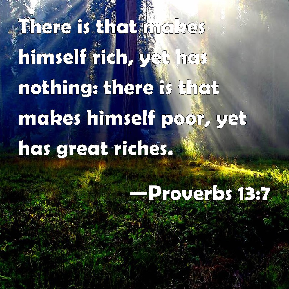 Choose a Background Proverbs 13:7 There is that makes himself rich, yet has nothing: there is that makes himself poor, yet has great riches. KJV: There is that maketh himself rich, yet hath nothing: there is that maketh himself poor, yet hath great riches. DRB: One is as it were rich, when he hath nothing: and another is as it were poor, when he hath great riches. DBT: There is that feigneth himself rich, and hath nothing; there is that maketh himself poor, and hath great wealth. ERV: There is that maketh himself rich, yet hath nothing: there is that maketh himself poor, yet hath great wealth. WBT: There is that maketh himself rich, yet hath nothing: there is that maketh himself poor, yet hath great riches. WEB: There are some who pretend to be rich, yet have nothing. There are some who pretend to be poor, yet have great wealth. YLT: There is who is making himself rich, and hath nothing, Who is making himself poor, and wealth is abundant.Links Proverbs 13:7 NIV • Proverbs 13:7 NLT • Proverbs 13:7 ESV • Proverbs 13:7 NASB • Proverbs 13:7 KJV • Proverbs 13:7 Interlinear • Proverbs 13:7 Commentaries • Proverbs 13:7 Parallel Texts • Proverbs 13:7 Bible Apps • Proverbs 13:7 Parallel • Bible Hub |
