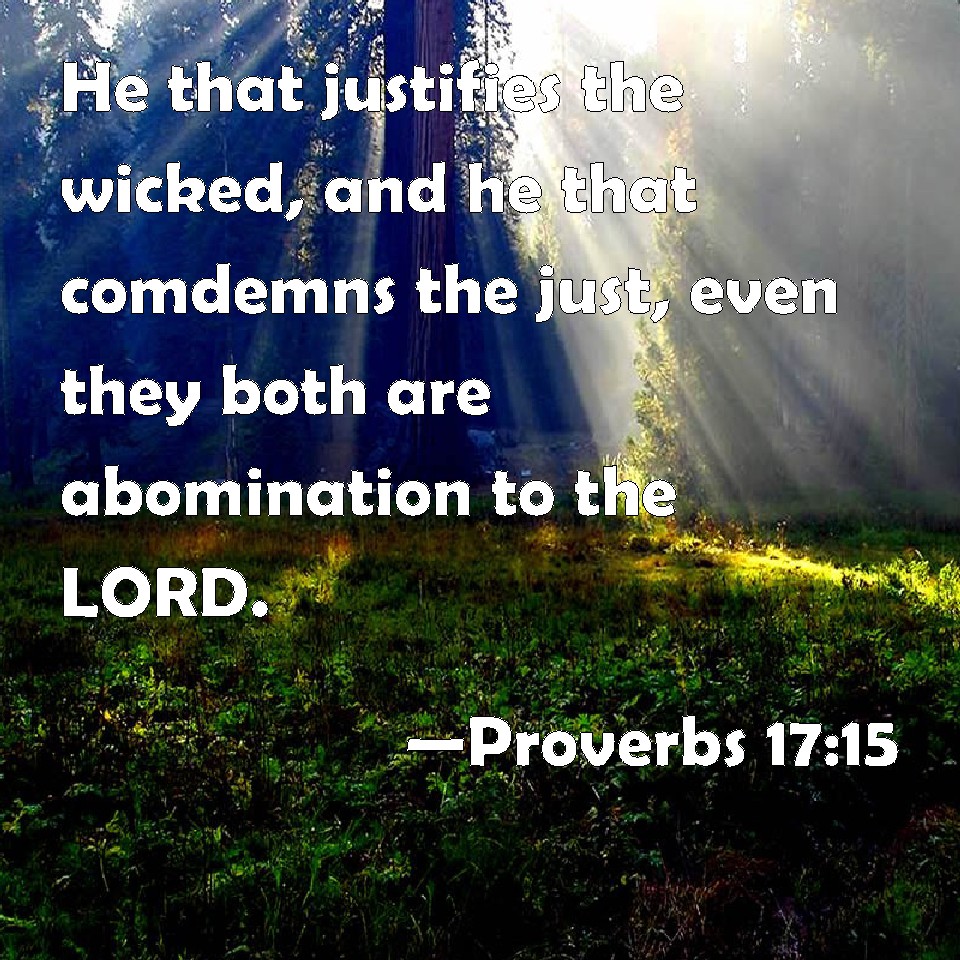 Choose a Background Proverbs 17:15 He that justifies the wicked, and he that comdemns the just, even they both are abomination to the LORD. KJV: He that justifieth the wicked, and he that condemneth the just, even they both are abomination to the LORD. DRB: He that justifieth the wicked, and he that condemneth the just, both are abominable before God. DBT: He that justifieth the wicked, and he that condemneth the righteous, even they both are abomination to Jehovah. ERV: He that justifieth the wicked, and he that condemneth the righteous, both of them alike are an abomination to the LORD. WBT: He that justifieth the wicked, and he that condemneth the just, even they both are abomination to the LORD. WEB: He who justifies the wicked, and he who condemns the righteous, both of them alike are an abomination to Yahweh. YLT: Whoso is justifying the wicked, And condemning the righteous, Even both of these are an abomination to Jehovah.Links Proverbs 17:15 NIV • Proverbs 17:15 NLT • Proverbs 17:15 ESV • Proverbs 17:15 NASB • Proverbs 17:15 KJV • Proverbs 17:15 Interlinear • Proverbs 17:15 Commentaries • Proverbs 17:15 Parallel Texts • Proverbs 17:15 Bible Apps • Proverbs 17:15 Parallel • Bible Hub |