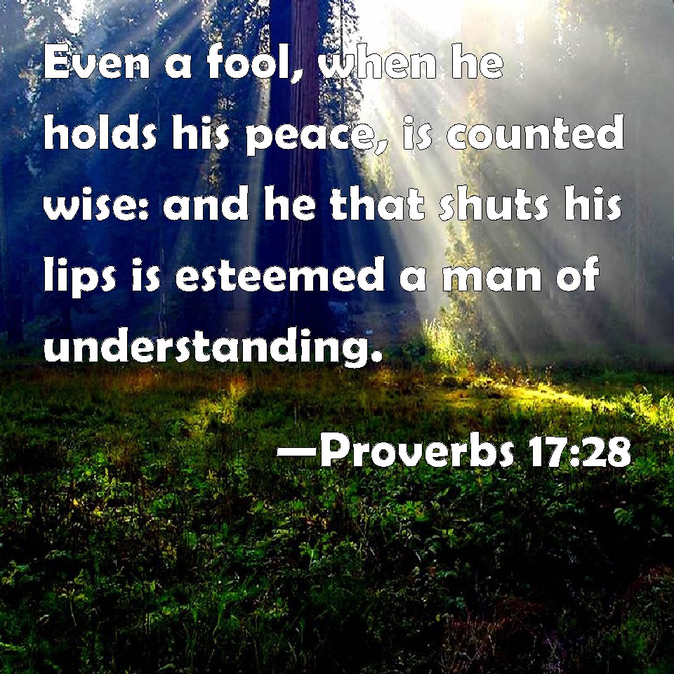 Choose a Background Proverbs 17:28 Even a fool, when he holds his peace, is counted wise: and he that shuts his lips is esteemed a man of understanding. KJV: Even a fool, when he holdeth his peace, is counted wise: and he that shutteth his lips is esteemed a man of understanding. DRB: Even a fool, if he will hold his peace shall be counted wise: and if he close his lips, a man of understanding. DBT: Even a fool when he holdeth his peace is reckoned wise, and he that shutteth his lips, intelligent. ERV: Even a fool, when he holdeth his peace, is counted wise: when he shutteth his lips, he is esteemed as prudent. WBT: Even a fool, when he holdeth his peace, is counted wise: and he that shutteth his lips is esteemed a man of understanding. WEB: Even a fool, when he keeps silent, is counted wise. When he shuts his lips, he is thought to be discerning. YLT: Even a fool keeping silence is reckoned wise, He who is shutting his lips intelligent!Links Proverbs 17:28 NIV • Proverbs 17:28 NLT • Proverbs 17:28 ESV • Proverbs 17:28 NASB • Proverbs 17:28 KJV • Proverbs 17:28 Interlinear • Proverbs 17:28 Commentaries • Proverbs 17:28 Parallel Texts • Proverbs 17:28 Bible Apps • Proverbs 17:28 Parallel • Bible Hub |