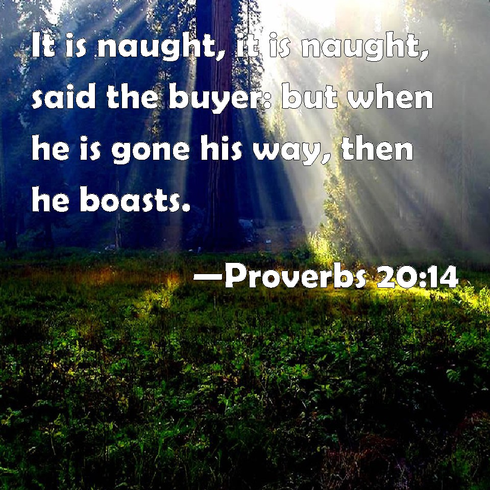 Choose a Background Proverbs 20:14 It is naught, it is naught, said the buyer: but when he is gone his way, then he boasts. KJV: It is naught, it is naught, saith the buyer: but when he is gone his way, then he boasteth. DRB: It is nought, it is nought, saith every buyer: and when he is gone away, then he will boast. DBT: Bad! bad! saith the buyer; but when he is gone his way, then he boasteth. ERV: It is naught, it is naught, saith the buyer: but when he is gone his way, then he boasteth. WBT: It is naught, it is naught, saith the buyer: but when he is gone, then he boasteth. WEB: "It's no good, it's no good," says the buyer; but when he is gone his way, then he boasts. YLT: 'Bad, bad,' saith the buyer, And going his way then he boasteth himself.Links Proverbs 20:14 NIV • Proverbs 20:14 NLT • Proverbs 20:14 ESV • Proverbs 20:14 NASB • Proverbs 20:14 KJV • Proverbs 20:14 Interlinear • Proverbs 20:14 Commentaries • Proverbs 20:14 Parallel Texts • Proverbs 20:14 Bible Apps • Proverbs 20:14 Parallel • Bible Hub |