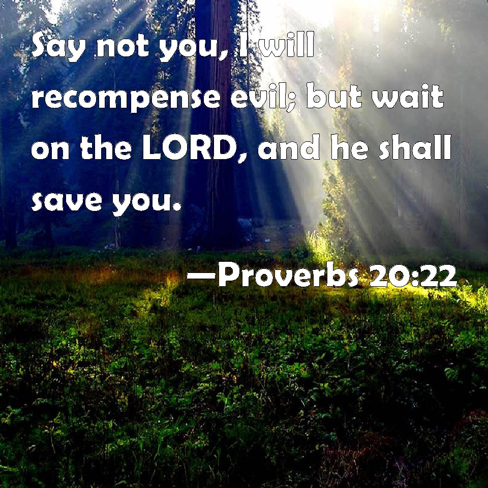 Choose a Background Proverbs 20:22 Say not you, I will recompense evil; but wait on the LORD, and he shall save you. KJV: Say not thou, I will recompense evil; but wait on the LORD, and he shall save thee. DRB: Say not: I will return evil: wait for the Lord and he will deliver thee. DBT: Say not, I will recompense evil: wait on Jehovah, and he shall save thee. ERV: Say not thou, I will recompense evil: wait on the LORD, and he shall save thee. WBT: Say not thou, I will recompense evil; but wait on the LORD, and he shall save thee. WEB: Don't say, "I will pay back evil." Wait for Yahweh, and he will save you. YLT: Do not say, 'I recompense evil,' Wait for Jehovah, and He delivereth thee.Links Proverbs 20:22 NIV • Proverbs 20:22 NLT • Proverbs 20:22 ESV • Proverbs 20:22 NASB • Proverbs 20:22 KJV • Proverbs 20:22 Interlinear • Proverbs 20:22 Commentaries • Proverbs 20:22 Parallel Texts • Proverbs 20:22 Bible Apps • Proverbs 20:22 Parallel • Bible Hub |