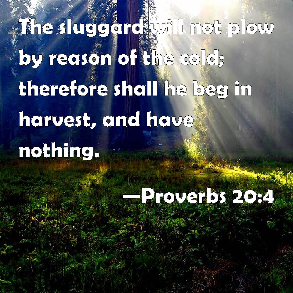 Proverbs 20:4 The sluggard will not plow by reason of the cold; therefore shall he beg in harvest, and have nothing.
