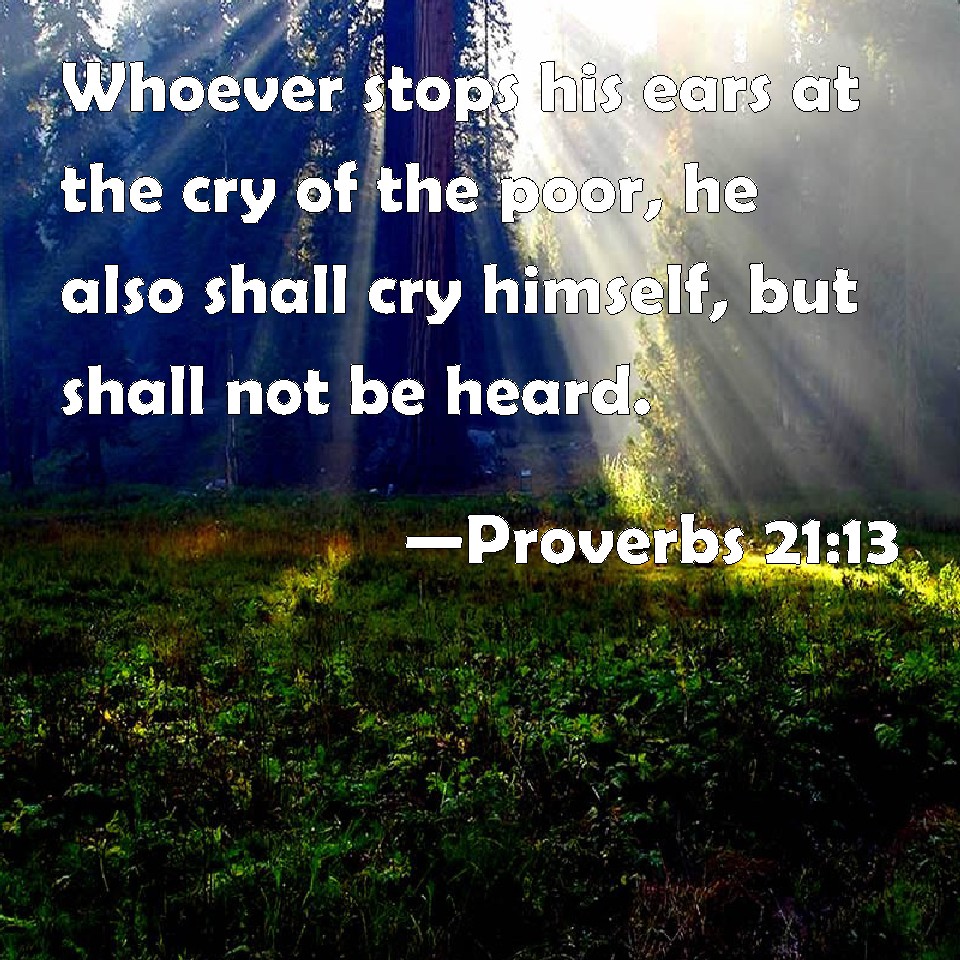 Choose a Background Proverbs 21:13 Whoever stops his ears at the cry of the poor, he also shall cry himself, but shall not be heard. KJV: Whoso stoppeth his ears at the cry of the poor, he also shall cry himself, but shall not be heard. DRB: He that stoppeth his ear against the cry of the poor, shall also cry himself and shall not be heard. DBT: Whoso stoppeth his ears at the cry of the poor, he also himself shall cry, and shall not be heard. ERV: Whoso stoppeth his ears at the cry of the poor, he also shall cry, but shall not be heard. WBT: Whoever stoppeth his ears at the cry of the poor, he also shall cry himself, but shall not be heard. WEB: Whoever stops his ears at the cry of the poor, he will also cry out, but shall not be heard. YLT: Whoso is shutting his ear from the cry of the poor, He also doth cry, and is not answered.Links Proverbs 21:13 NIV • Proverbs 21:13 NLT • Proverbs 21:13 ESV • Proverbs 21:13 NASB • Proverbs 21:13 KJV • Proverbs 21:13 Interlinear • Proverbs 21:13 Commentaries • Proverbs 21:13 Parallel Texts • Proverbs 21:13 Bible Apps • Proverbs 21:13 Parallel • Bible Hub |