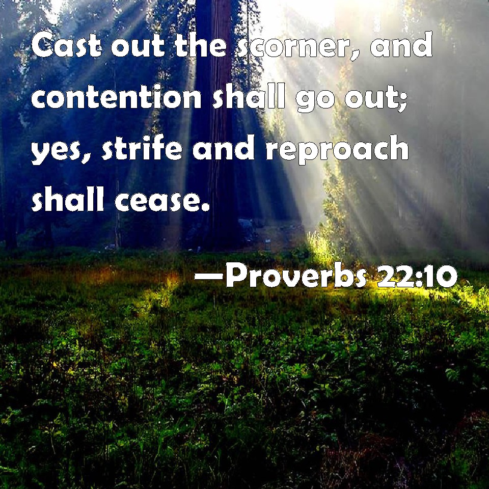 Choose a Background Proverbs 22:10 Cast out the scorner, and contention shall go out; yes, strife and reproach shall cease. KJV: Cast out the scorner, and contention shall go out; yea, strife and reproach shall cease. DRB: Cast out the scoffer, and contention shall go out with him, and quarrels and reproaches shall cease. DBT: Cast out the scorner, and contention will depart, and strife and ignominy shall cease. ERV: Cast out the scorner, and contention shall go out; yea, strife and ignominy shall cease. WBT: Cast out the scorner, and contention shall end; yes, strife and reproach shall cease. WEB: Drive out the mocker, and strife will go out; yes, quarrels and insults will stop. YLT: Cast out a scorner — and contention goeth out, And strife and shame cease.Links Proverbs 22:10 NIV • Proverbs 22:10 NLT • Proverbs 22:10 ESV • Proverbs 22:10 NASB • Proverbs 22:10 KJV • Proverbs 22:10 Interlinear • Proverbs 22:10 Commentaries • Proverbs 22:10 Parallel Texts • Proverbs 22:10 Bible Apps • Proverbs 22:10 Parallel • Bible Hub |