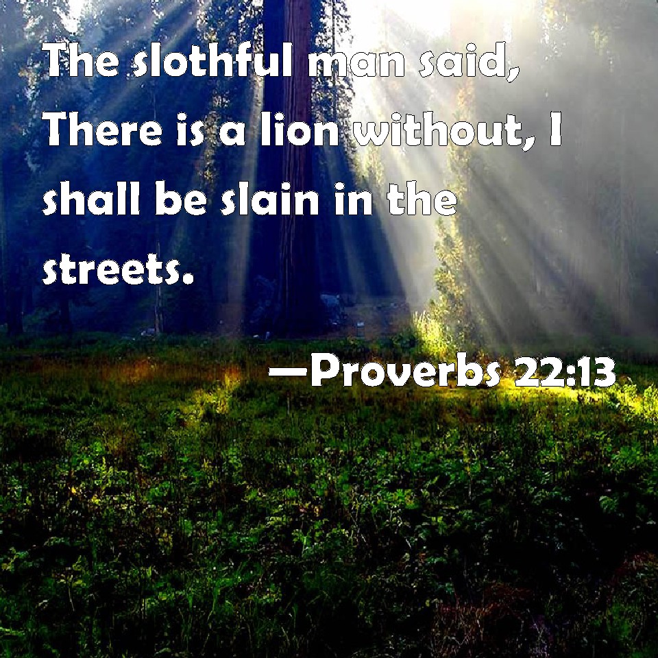 Choose a Background Proverbs 22:13 The slothful man said, There is a lion without, I shall be slain in the streets. KJV: The slothful man saith, There is a lion without, I shall be slain in the streets. DRB: The slothful man saith: There is a lion without, I shall be slain in the midst of the streets. DBT: The sluggard saith, There is a lion without, I shall be killed in the streets! ERV: The sluggard saith, There is a lion without: I shall be murdered in the streets. WBT: The slothful man saith, There is a lion without, I shall be slain in the streets. WEB: The sluggard says, "There is a lion outside! I will be killed in the streets!" YLT: The slothful hath said, 'A lion is without, In the midst of the broad places I am slain.'Links Proverbs 22:13 NIV • Proverbs 22:13 NLT • Proverbs 22:13 ESV • Proverbs 22:13 NASB • Proverbs 22:13 KJV • Proverbs 22:13 Interlinear • Proverbs 22:13 Commentaries • Proverbs 22:13 Parallel Texts • Proverbs 22:13 Bible Apps • Proverbs 22:13 Parallel • Bible Hub |
