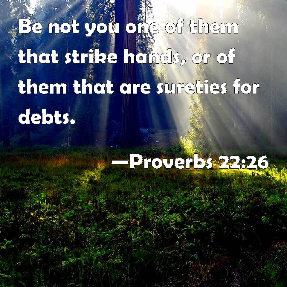 Proverbs 22:26 Be not you one of them that strike hands, or of them that are sureties for debts.