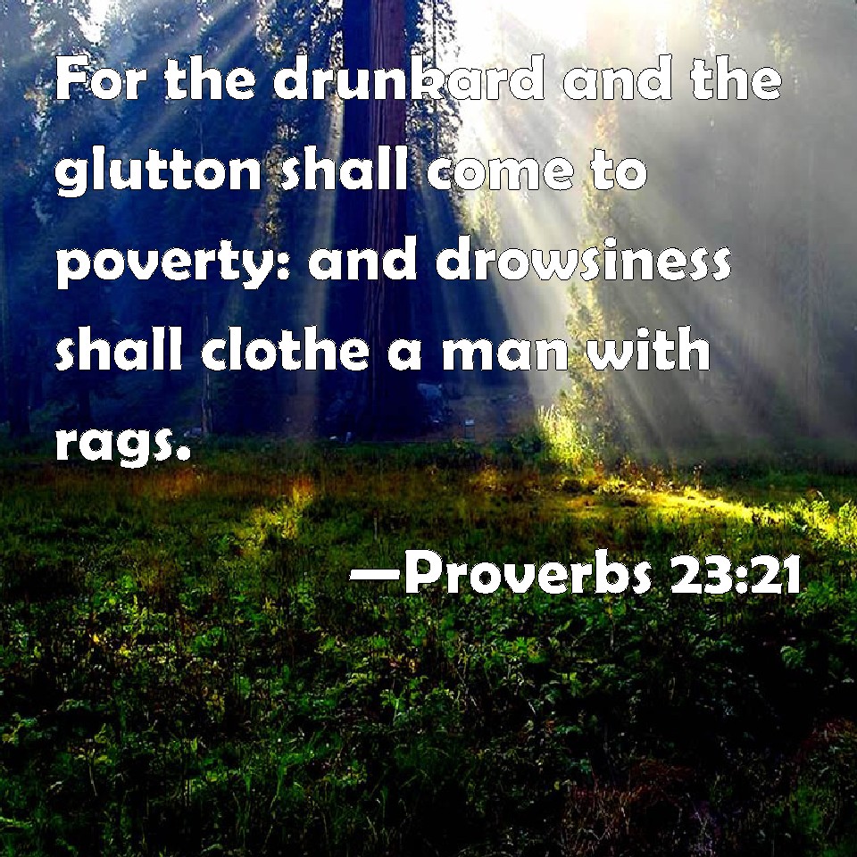 Proverbs 23:21 For the drunkard and the glutton shall come to poverty: and drowsiness shall clothe a man with rags.