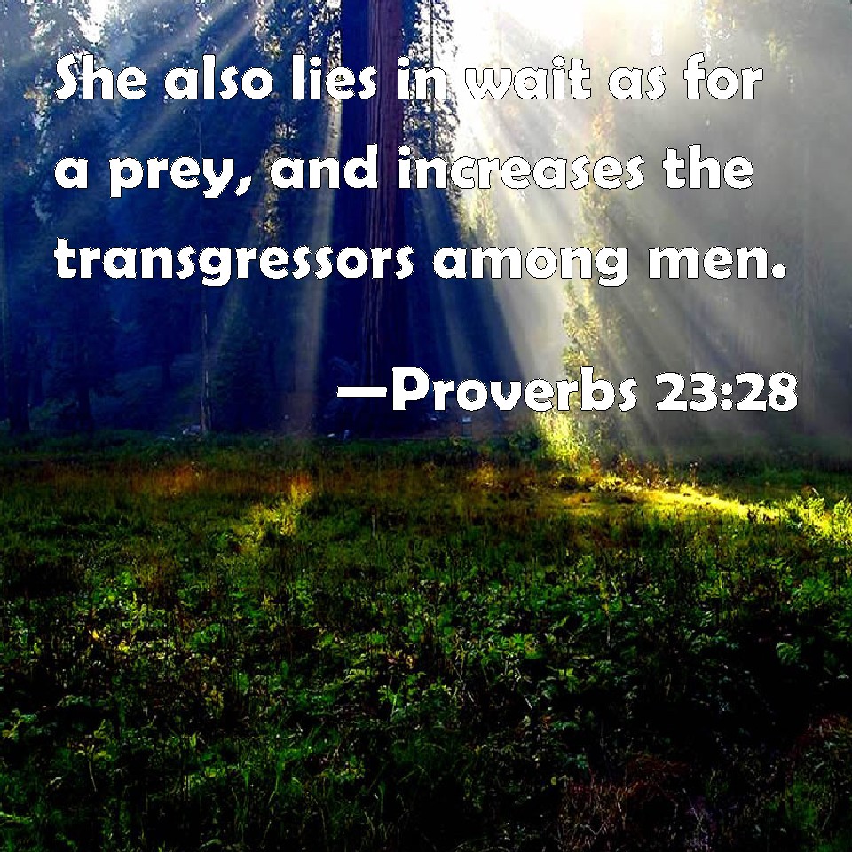 Choose a Background Proverbs 23:28 She also lies in wait as for a prey, and increases the transgressors among men. KJV: She also lieth in wait as for a prey, and increaseth the transgressors among men. DRB: She lieth in wait in the way as a robber, and him whom she shall see unwary, she will kill. DBT: She also lieth in wait as a robber, and increaseth the treacherous among men. ERV: Yea, she lieth in wait as a robber, and increaseth the treacherous among men. WBT: She also lieth in wait as for a prey, and increaseth the transgressors among men. WEB: Yes, she lies in wait like a robber, and increases the unfaithful among men. YLT: She also, as catching prey, lieth in wait, And the treacherous among men she increaseth.Links Proverbs 23:28 NIV • Proverbs 23:28 NLT • Proverbs 23:28 ESV • Proverbs 23:28 NASB • Proverbs 23:28 KJV • Proverbs 23:28 Interlinear • Proverbs 23:28 Commentaries • Proverbs 23:28 Parallel Texts • Proverbs 23:28 Bible Apps • Proverbs 23:28 Parallel • Bible Hub |
