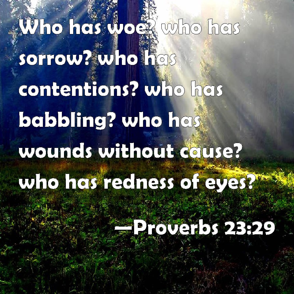 Proverbs 23:29 Who has woe? who has sorrow? who has contentions? who has babbling? who has wounds without cause? who has redness of eyes?