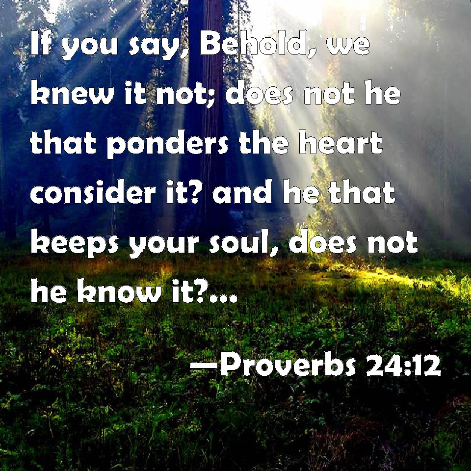 Choose a Background Proverbs 24:12 If you say, Behold, we knew it not; does not he that ponders the heart consider it? and he that keeps your soul, does not he know it? and shall not he render to every man according to his works? KJV: If thou sayest, Behold, we knew it not; doth not he that pondereth the heart consider it? and he that keepeth thy soul, doth not he know it? and shall not he render to every man according to his works? DRB: If thou say: I have not strength enough: he that seeth into the heart, he understandeth, and nothing deceiveth the keeper of thy soul, end he shall render to a man according to his works. DBT: If thou sayest, Behold, we knew it not, will not he that weigheth the hearts consider it? And he that preserveth thy soul, he knoweth it; and he rendereth to man according to his work. ERV: If thou sayest, Behold, we knew not this: doth not he that weigheth the hearts consider it? and he that keepeth thy soul, doth not he know it? and shall not he render to every man according to his work? WBT: If thou sayest, Behold, we knew it not; doth not he that pondereth the heart consider it? and he that keepeth thy soul, doth not he know it? and will not he render to every man according to his works? WEB: If you say, "Behold, we didn't know this;" doesn't he who weighs the hearts consider it? He who keeps your soul, doesn't he know it? Shall he not render to every man according to his work? YLT: When thou sayest, 'Lo, we knew not this.' Is not the Ponderer of hearts He who understandeth? And the Keeper of thy soul He who knoweth? And He hath rendered to man according to his work.Links Proverbs 24:12 NIV • Proverbs 24:12 NLT • Proverbs 24:12 ESV • Proverbs 24:12 NASB • Proverbs 24:12 KJV • Proverbs 24:12 Interlinear • Proverbs 24:12 Commentaries • Proverbs 24:12 Parallel Texts • Proverbs 24:12 Bible Apps • Proverbs 24:12 Parallel • Bible Hub |