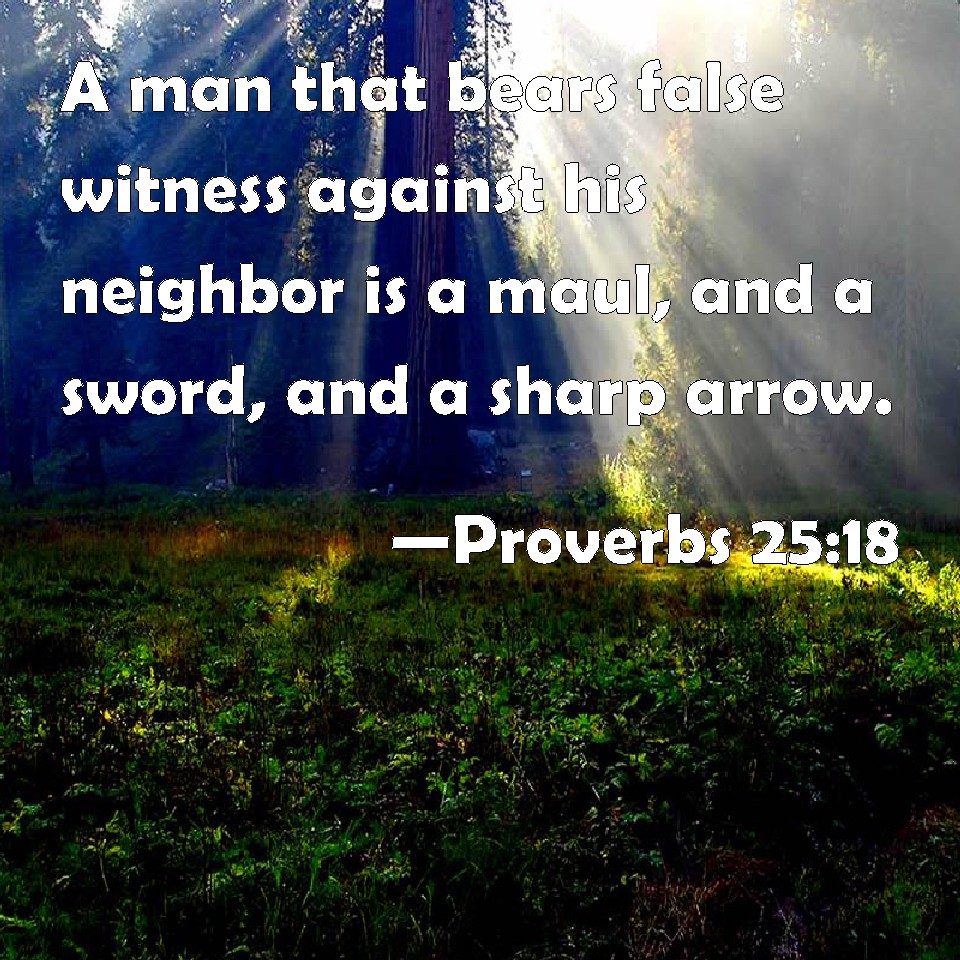 Choose a Background Proverbs 25:18 A man that bears false witness against his neighbor is a maul, and a sword, and a sharp arrow. KJV: A man that beareth false witness against his neighbour is a maul, and a sword, and a sharp arrow. DRB: A man that beareth false witness against his neighbour, is like a dart and a sword and a sharp arrow. DBT: A maul, and a sword, and a sharp arrow, is a man that beareth false witness against his neighbour. ERV: A man that beareth false witness against his neighbour is a maul, and a sword, and a sharp arrow. WBT: A man that beareth false witness against his neighbor is a maul, and a sword, and a sharp arrow. WEB: A man who gives false testimony against his neighbor is like a club, a sword, or a sharp arrow. YLT: A maul, and a sword, and a sharp arrow, Is the man testifying against his neighbour a false testimony.Links Proverbs 25:18 NIV • Proverbs 25:18 NLT • Proverbs 25:18 ESV • Proverbs 25:18 NASB • Proverbs 25:18 KJV • Proverbs 25:18 Interlinear • Proverbs 25:18 Commentaries • Proverbs 25:18 Parallel Texts • Proverbs 25:18 Bible Apps • Proverbs 25:18 Parallel • Bible Hub |