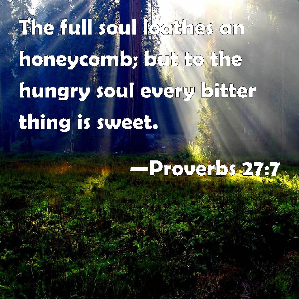 Proverbs 27:7 The full soul loathes an honeycomb; but to the hungry soul every bitter thing is sweet.