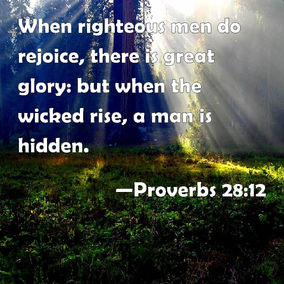 Choose a Background Proverbs 28:12 When righteous men do rejoice, there is great glory: but when the wicked rise, a man is hidden. KJV: When righteous men do rejoice, there is great glory: but when the wicked rise, a man is hidden. DRB: In the joy of the just there is great glory: when the wicked reign, men are ruined. DBT: When the righteous triumph, there is great glory; but when the wicked rise, men conceal themselves. ERV: When the righteous triumph, there is great glory: but when the wicked rise, men hide themselves. WBT: When righteous men rejoice, there is great glory: but when the wicked rise, a man is hidden. WEB: When the righteous triumph, there is great glory; but when the wicked rise, men hide themselves. YLT: In the exulting of the righteous the glory is abundant, And in the rising of the wicked man is apprehensive.Links Proverbs 28:12 NIV • Proverbs 28:12 NLT • Proverbs 28:12 ESV • Proverbs 28:12 NASB • Proverbs 28:12 KJV • Proverbs 28:12 Interlinear • Proverbs 28:12 Commentaries • Proverbs 28:12 Parallel Texts • Proverbs 28:12 Bible Apps • Proverbs 28:12 Parallel • Bible Hub |