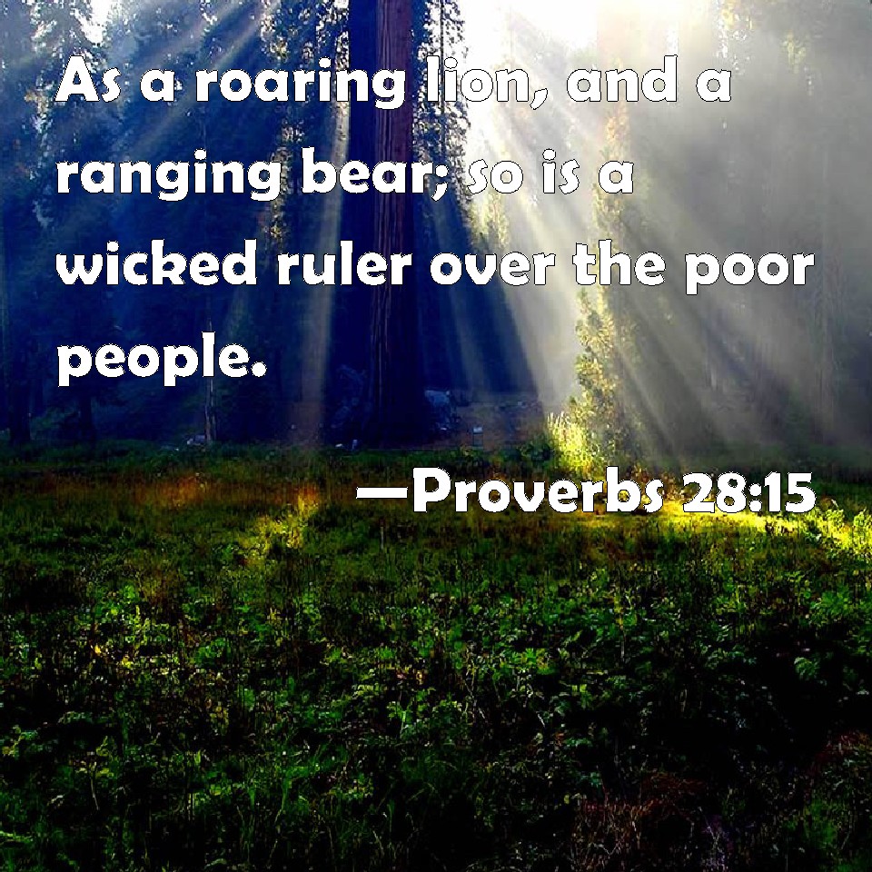 Choose a Background Proverbs 28:15 As a roaring lion, and a ranging bear; so is a wicked ruler over the poor people. KJV: As a roaring lion, and a ranging bear; so is a wicked ruler over the poor people. DRB: As a roaring lion, and a hungry bear, so is a wicked prince over the poor people. DBT: A roaring lion, and a ranging bear, is a wicked ruler over a poor people. ERV: As a roaring lion, and a ranging bear; so is a wicked ruler over a poor people. WBT: As a roaring lion, and a ranging bear; so is a wicked ruler over the poor people. WEB: As a roaring lion or a charging bear, so is a wicked ruler over helpless people. YLT: A growling lion, and a ranging bear, Is the wicked ruler over a poor people.Links Proverbs 28:15 NIV • Proverbs 28:15 NLT • Proverbs 28:15 ESV • Proverbs 28:15 NASB • Proverbs 28:15 KJV • Proverbs 28:15 Interlinear • Proverbs 28:15 Commentaries • Proverbs 28:15 Parallel Texts • Proverbs 28:15 Bible Apps • Proverbs 28:15 Parallel • Bible Hub |