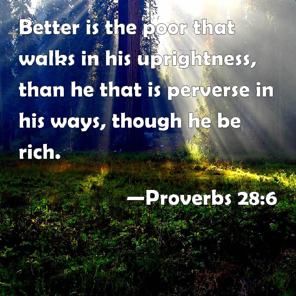 Choose a Background Proverbs 28:6 Better is the poor that walks in his uprightness, than he that is perverse in his ways, though he be rich. KJV: Better is the poor that walketh in his uprightness, than he that is perverse in his ways, though he be rich. DRB: Better is the poor man walking in his simplicity, than the rich in crooked ways. DBT: Better is the poor that walketh in his integrity, than he that is perverse, double in ways, though he be rich. ERV: Better is the poor that walketh in his integrity, than he that is perverse in his ways, though he be rich. WBT: Better is the poor that walketh in his uprightness, than he that is perverse in his ways, though he is rich. WEB: Better is the poor who walks in his integrity, than he who is perverse in his ways, and he is rich. YLT: Better is the poor walking in his integrity, Than the perverse of ways who is rich.Links Proverbs 28:6 NIV • Proverbs 28:6 NLT • Proverbs 28:6 ESV • Proverbs 28:6 NASB • Proverbs 28:6 KJV • Proverbs 28:6 Interlinear • Proverbs 28:6 Commentaries • Proverbs 28:6 Parallel Texts • Proverbs 28:6 Bible Apps • Proverbs 28:6 Parallel • Bible Hub |