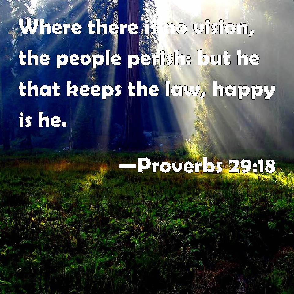 Choose a Background Proverbs 29:18 Where there is no vision, the people perish: but he that keeps the law, happy is he. KJV: Where there is no vision, the people perish: but he that keepeth the law, happy is he. DRB: When prophecy shall fail, the people shall be scattered abroad: but he that keepeth the law is blessed. DBT: Where there is no vision the people cast off restraint; but happy is he that keepeth the law. ERV: Where there is no vision, the people cast off restraint: but he that keepeth the law, happy is he. WBT: Where there is no vision, the people perish: but he that keepeth the law, happy is he. WEB: Where there is no revelation, the people cast off restraint; but one who keeps the law is blessed. YLT: Without a Vision is a people made naked, And whoso is keeping the law, O his happiness!Links Proverbs 29:18 NIV • Proverbs 29:18 NLT • Proverbs 29:18 ESV • Proverbs 29:18 NASB • Proverbs 29:18 KJV • Proverbs 29:18 Interlinear • Proverbs 29:18 Commentaries • Proverbs 29:18 Parallel Texts • Proverbs 29:18 Bible Apps • Proverbs 29:18 Parallel • Bible Hub |