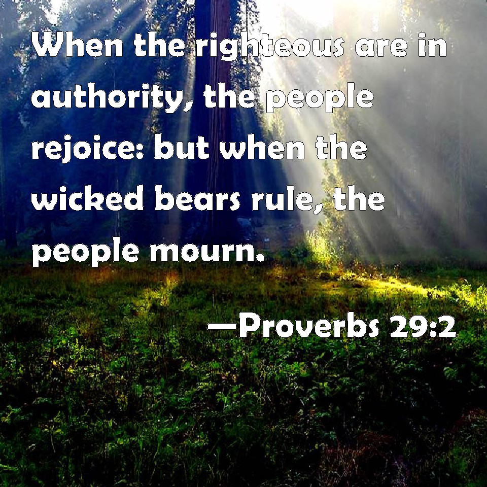 Choose a Background Proverbs 29:2 When the righteous are in authority, the people rejoice: but when the wicked bears rule, the people mourn. KJV: When the righteous are in authority, the people rejoice: but when the wicked beareth rule, the people mourn. DRB: When just men increase, the people shall rejoice: when the wicked shall bear rule, the people shall mourn. DBT: When the righteous increase, the people rejoice; but when the wicked beareth rule, the people mourn. ERV: When the righteous are increased, the people rejoice: but when a wicked man beareth rule, the people sigh. WBT: When the righteous are in authority, the people rejoice: but when the wicked beareth rule, the people mourn. WEB: When the righteous thrive, the people rejoice; but when the wicked rule, the people groan. YLT: In the multiplying of the righteous the people rejoice, And in the ruling of the wicked the people sigh.Links Proverbs 29:2 NIV • Proverbs 29:2 NLT • Proverbs 29:2 ESV • Proverbs 29:2 NASB • Proverbs 29:2 KJV • Proverbs 29:2 Interlinear • Proverbs 29:2 Commentaries • Proverbs 29:2 Parallel Texts • Proverbs 29:2 Bible Apps • Proverbs 29:2 Parallel • Bible Hub |