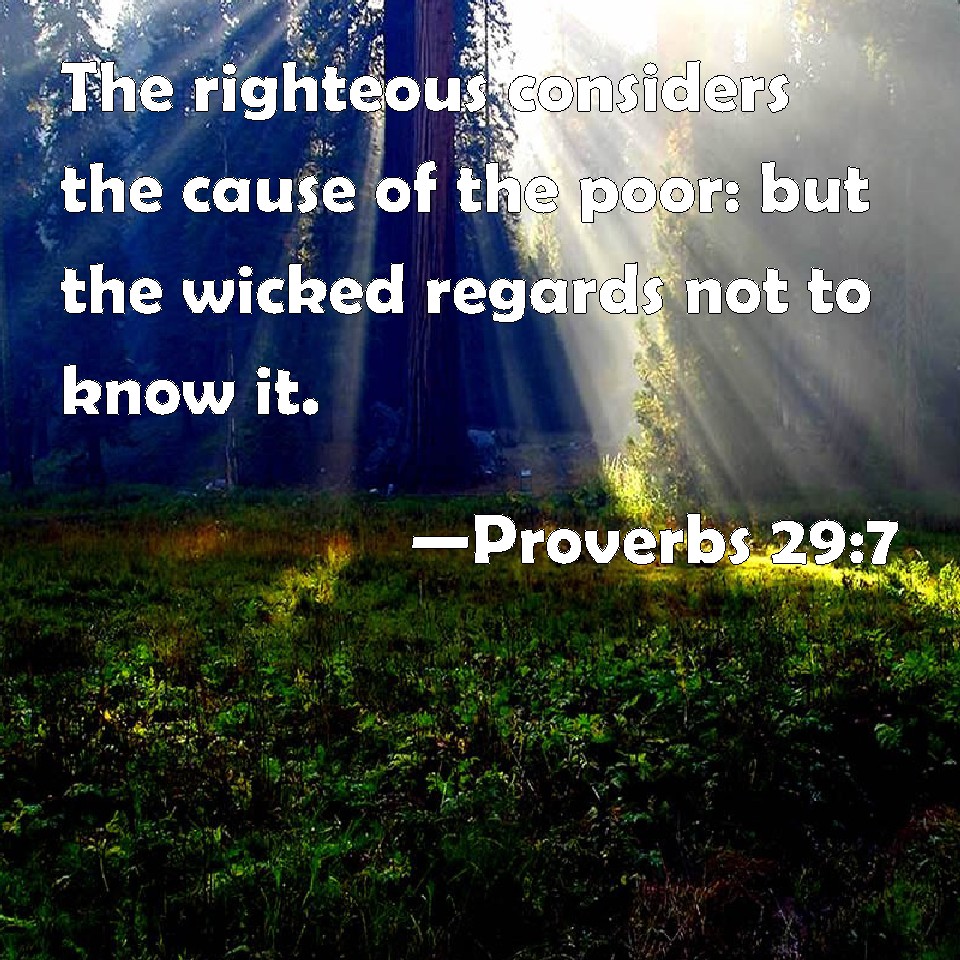 Proverbs 29:7 The righteous considers the cause of the poor: but the wicked regards not to know it.