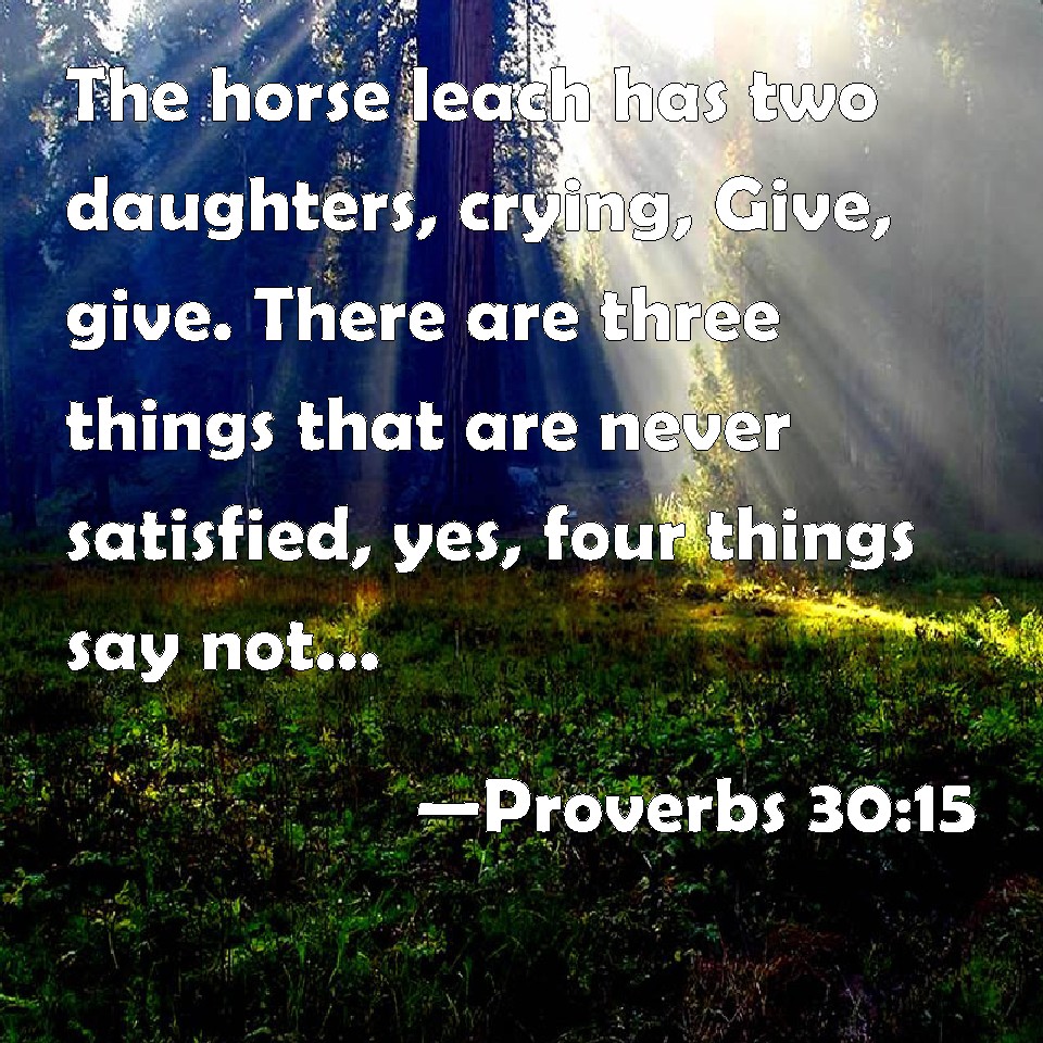 Choose a Background Proverbs 30:15 The horse leach has two daughters, crying, Give, give. There are three things that are never satisfied, yes, four things say not, It is enough: KJV: The horseleach hath two daughters, crying, Give, give. There are three things that are never satisfied, yea, four things say not, It is enough: DRB: The horseleech hath two daughters that say: Bring, bring. There are three things that never are satisfied, and the fourth never saith: It is enough. DBT: The leech hath two daughters: Give, give. There are three things never satisfied; four which say not, It is enough: ERV: The horseleach hath two daughters, Crying, Give, give. There are three things that are never satisfied, yea, four that say not, Enough: WBT: The horse-leech hath two daughters, crying, Give, give. There are three things that are never satisfied, yes, four things say not, It is enough: WEB: "The leach has two daughters: 'Give, give.' "There are three things that are never satisfied; four that don't say, 'Enough:' YLT: To the leech are two daughters, 'Give, give, Lo, three things are not satisfied, Four have not said 'Sufficiency;'Links Proverbs 30:15 NIV • Proverbs 30:15 NLT • Proverbs 30:15 ESV • Proverbs 30:15 NASB • Proverbs 30:15 KJV • Proverbs 30:15 Interlinear • Proverbs 30:15 Commentaries • Proverbs 30:15 Parallel Texts • Proverbs 30:15 Bible Apps • Proverbs 30:15 Parallel • Bible Hub |