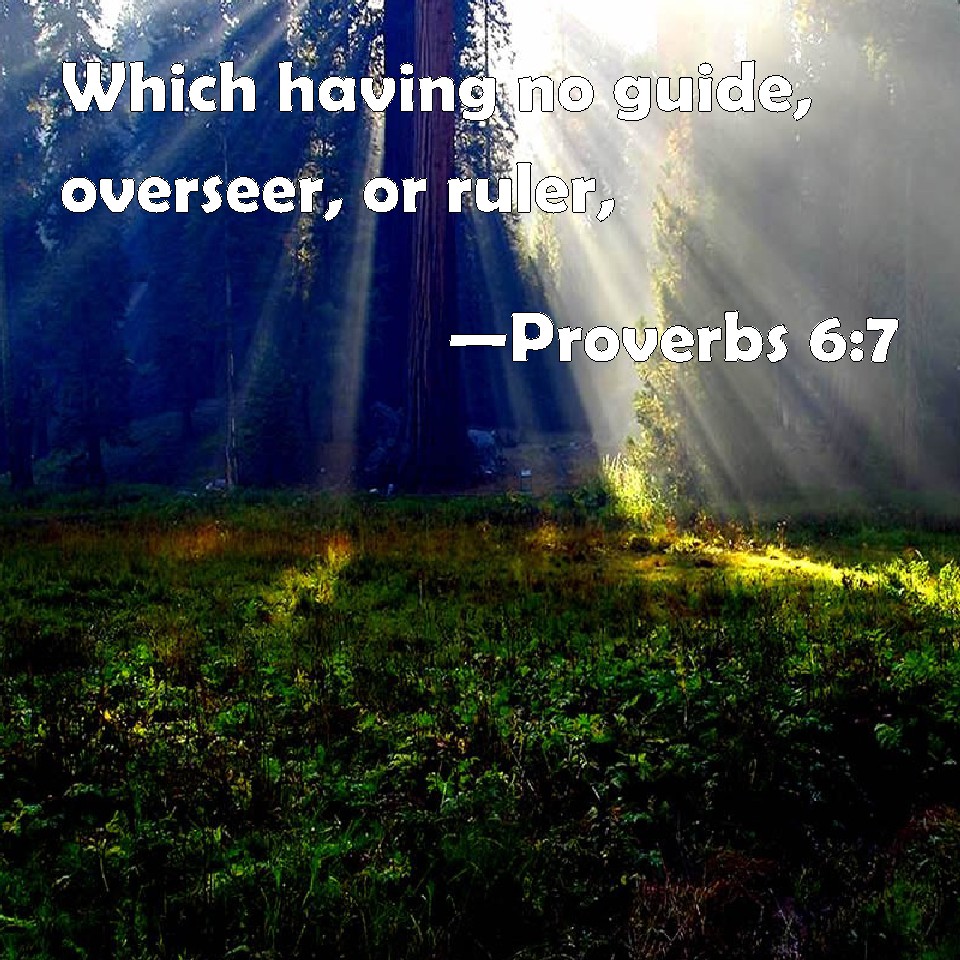 Choose a Background Proverbs 6:7 Which having no guide, overseer, or ruler, KJV: Which having no guide, overseer, or ruler, DRB: Which, although she hath no guide, nor master, nor captain, DBT: which having no chief, overseer, or ruler, ERV: Which having no chief, overseer, or ruler, WBT: Which having no guide, overseer, or ruler, WEB: which having no chief, overseer, or ruler, YLT: Which hath not captain, overseer, and ruler,Links Proverbs 6:7 NIV • Proverbs 6:7 NLT • Proverbs 6:7 ESV • Proverbs 6:7 NASB • Proverbs 6:7 KJV • Proverbs 6:7 Interlinear • Proverbs 6:7 Commentaries • Proverbs 6:7 Parallel Texts • Proverbs 6:7 Bible Apps • Proverbs 6:7 Parallel • Bible Hub |