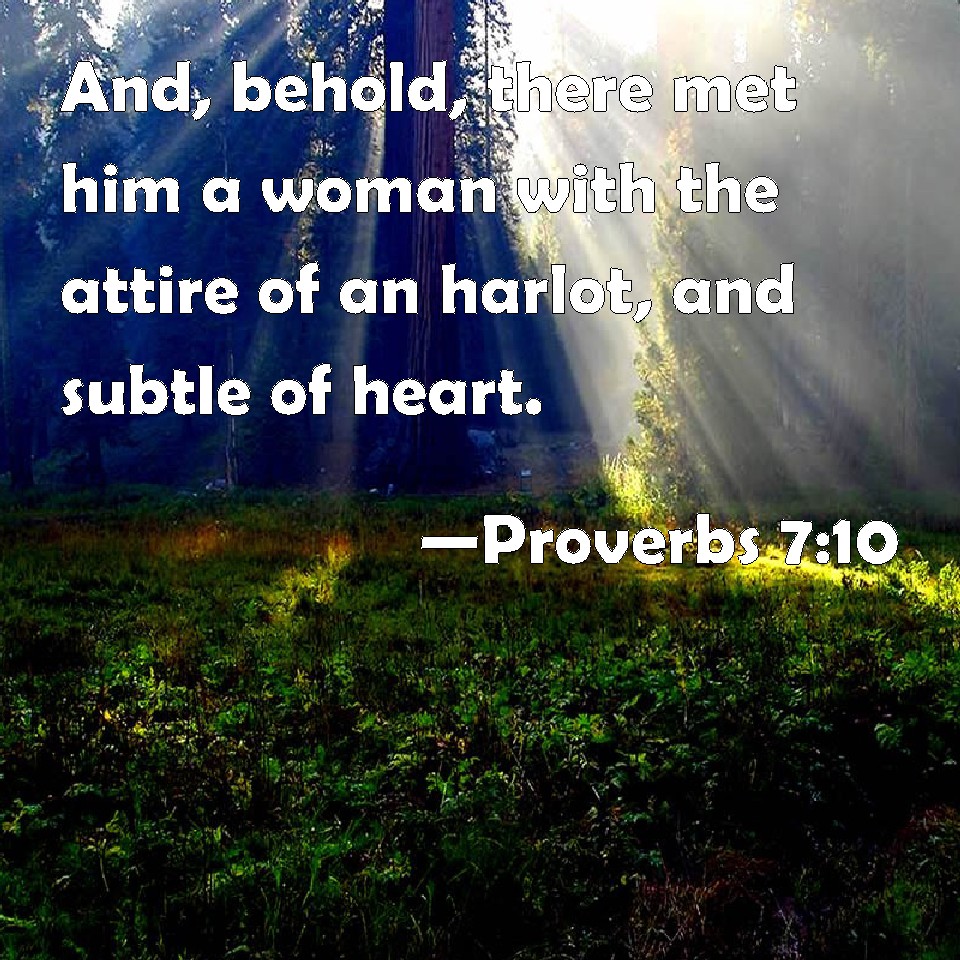 Choose a Background Proverbs 7:10 And, behold, there met him a woman with the attire of an harlot, and subtle of heart. KJV: And, behold, there met him a woman with the attire of an harlot, and subtil of heart. DRB: And behold a woman meeteth him in harlot's attire prepared to deceive souls; talkative and wandering, DBT: And behold, there met him a woman in the attire of a harlot, and subtle of heart. ERV: And, behold, there met him a woman with the attire of an harlot, and wily of heart. WBT: And behold, there met him a woman with the attire of a harlot, and subtil of heart. WEB: Behold, there a woman met him with the attire of a prostitute, and with crafty intent. YLT: And, lo, a woman to meet him — (A harlot's dress, and watchful of heart,Links Proverbs 7:10 NIV • Proverbs 7:10 NLT • Proverbs 7:10 ESV • Proverbs 7:10 NASB • Proverbs 7:10 KJV • Proverbs 7:10 Interlinear • Proverbs 7:10 Commentaries • Proverbs 7:10 Parallel Texts • Proverbs 7:10 Bible Apps • Proverbs 7:10 Parallel • Bible Hub |
