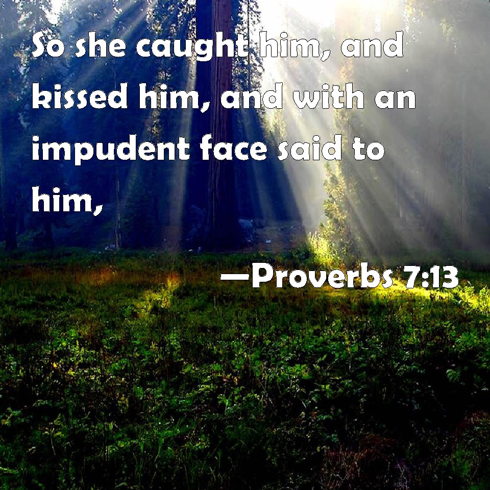 Choose a Background Proverbs 7:13 So she caught him, and kissed him, and with an impudent face said to him, KJV: So she caught him, and kissed him, and with an impudent face said unto him, DRB: And catching the young man, she kisseth him, and with an impudent face, flattereth, saying: DBT: And she caught him and kissed him, and with an impudent face said unto him, ERV: So she caught him, and kissed him, and with an impudent face she said unto him: WBT: So she caught him, and kissed him, and with an impudent face said to him, WEB: So she caught him, and kissed him. With an impudent face she said to him: YLT: And she laid hold on him, and kissed him, She hath hardened her face, and saith to him,Links Proverbs 7:13 NIV • Proverbs 7:13 NLT • Proverbs 7:13 ESV • Proverbs 7:13 NASB • Proverbs 7:13 KJV • Proverbs 7:13 Interlinear • Proverbs 7:13 Commentaries • Proverbs 7:13 Parallel Texts • Proverbs 7:13 Bible Apps • Proverbs 7:13 Parallel • Bible Hub |