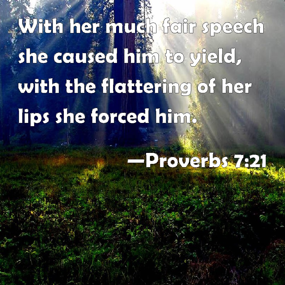 Proverbs 7:21 With her much fair speech she caused him to yield, with the flattering of her lips she forced him.