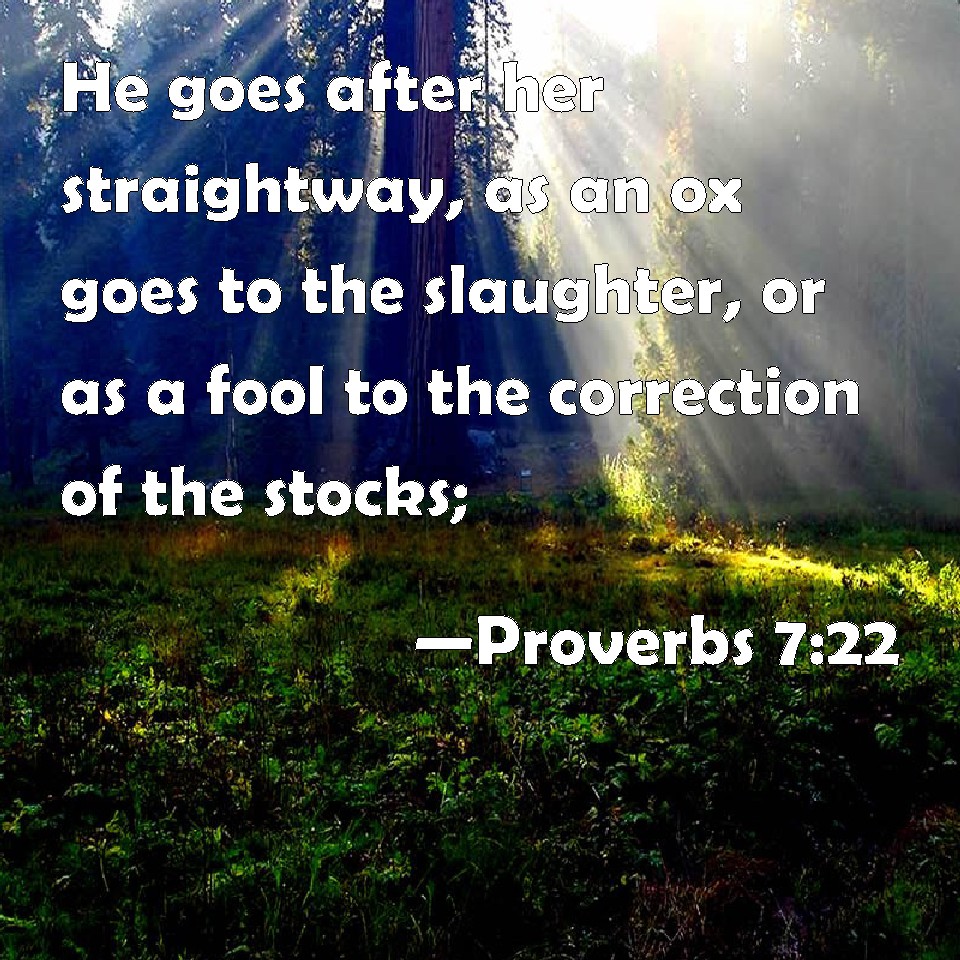 Choose a Background Proverbs 7:22 He goes after her straightway, as an ox goes to the slaughter, or as a fool to the correction of the stocks; KJV: He goeth after her straightway, as an ox goeth to the slaughter, or as a fool to the correction of the stocks; DRB: Immediately he followeth her as an ox led to be a victim, and as a lamb playing the wanton, and not knowing that he is drawn like a fool to bonds, DBT: He went after her straightway, as an ox goeth to the slaughter, and as stocks serve for the correction of the fool; ERV: He goeth after her straightway, as an ox goeth to the slaughter, or as fetters to the correction of the fool; WBT: He goeth after her quickly, as an ox goeth to the slaughter, or as a fool to the correction of the stocks; WEB: He followed her immediately, as an ox goes to the slaughter, as a fool stepping into a noose. YLT: He is going after her straightway, As an ox unto the slaughter he cometh, And as a fetter unto the chastisement of a fool,Links Proverbs 7:22 NIV • Proverbs 7:22 NLT • Proverbs 7:22 ESV • Proverbs 7:22 NASB • Proverbs 7:22 KJV • Proverbs 7:22 Interlinear • Proverbs 7:22 Commentaries • Proverbs 7:22 Parallel Texts • Proverbs 7:22 Bible Apps • Proverbs 7:22 Parallel • Bible Hub |