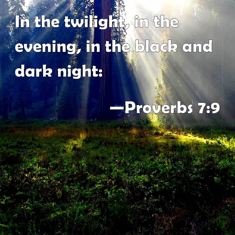 Choose a Background Proverbs 7:9 In the twilight, in the evening, in the black and dark night: KJV: In the twilight, in the evening, in the black and dark night: DRB: In the dark, when it grows late, in the darkness and obscurity of the night, DBT: in the twilight, in the evening of the day, in the blackness of night and the darkness. ERV: In the twilight, in the evening of the day, in the blackness of night and the darkness. WBT: In the twilight, in the evening, in the black and dark night: WEB: in the twilight, in the evening of the day, in the middle of the night and in the darkness. YLT: In the twilight — in the evening of day, In the darkness of night and blackness.Links Proverbs 7:9 NIV • Proverbs 7:9 NLT • Proverbs 7:9 ESV • Proverbs 7:9 NASB • Proverbs 7:9 KJV • Proverbs 7:9 Interlinear • Proverbs 7:9 Commentaries • Proverbs 7:9 Parallel Texts • Proverbs 7:9 Bible Apps • Proverbs 7:9 Parallel • Bible Hub |
