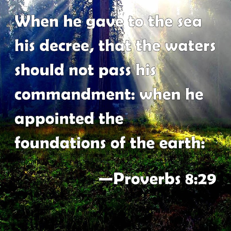 Choose a Background Proverbs 8:29 When he gave to the sea his decree, that the waters should not pass his commandment: when he appointed the foundations of the earth: KJV: When he gave to the sea his decree, that the waters should not pass his commandment: when he appointed the foundations of the earth: DRB: When he compassed the sea with its bounds, and set a law to the waters that they should not pass their limits: when be balanced the foundations of the earth; DBT: when he imposed on the sea his decree that the waters should not pass his commandment, when he appointed the foundations of the earth: ERV: When he gave to the sea its bound, that the waters should not transgress his commandment: when he marked out the foundations of the earth: WBT: When he gave to the sea his decree, that the waters should not pass his commandment: when he appointed the foundations of the earth: WEB: when he gave to the sea its boundary, that the waters should not violate his commandment, when he marked out the foundations of the earth; YLT: In His setting for the sea its limit, And the waters transgress not His command, In His decreeing the foundations of earth,Links Proverbs 8:29 NIV • Proverbs 8:29 NLT • Proverbs 8:29 ESV • Proverbs 8:29 NASB • Proverbs 8:29 KJV • Proverbs 8:29 Interlinear • Proverbs 8:29 Commentaries • Proverbs 8:29 Parallel Texts • Proverbs 8:29 Bible Apps • Proverbs 8:29 Parallel • Bible Hub |